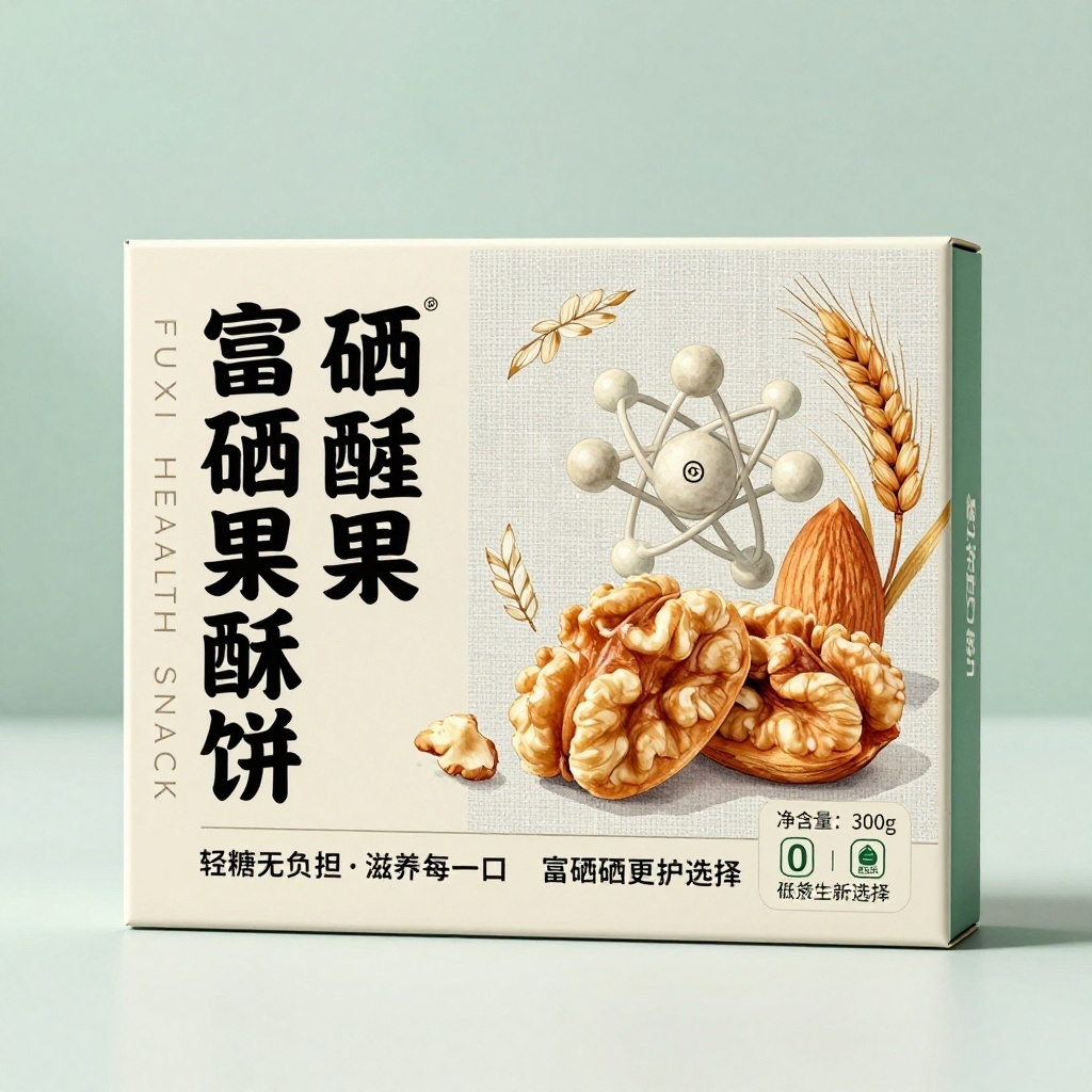 产品:富硒坚果酥饼;品牌名:禾养本味;包装样式:横版纸盒,尺寸21.5cm×6cm×14.5cm,选用环保微糙艺术纸,哑光触感传递天然质感;包装营销卖点:“0反式脂肪酸·低糖轻享”,聚焦健康配方与养生价值;包装主视觉面排版:左右排版,左侧主标题“富硒坚果酥饼”黑体加粗48pt,副标题“FUXI HEALTH SNACK”12pt细衬线体垂直排列于左缘;右侧为水彩天然风主图案——写意核桃仁与杏仁簇拥抽象硒原子结构,背景层铺浅灰麻布肌理,点缀手绘麦穗与叶脉飘散装饰图案,底部嵌“净含量:300g”及“0反式”“低糖认证”图标文案8pt;二级宣传语“轻糖无负担·滋养每一口”+“富硒更护体·养生新选择”各10pt横向置于图案下方;设计风格:极简东方养生美学;主题配色:主色燕麦灰,辅色松石绿。