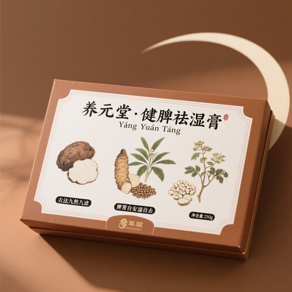 产品:药食同源调理脾胃祛湿膏方;品牌名:养元堂;包装样式:长方形精品礼盒,选用哑光特种纸,触感温润如古籍封面;包装营销卖点:以“千年本草智慧”为核心,主视觉提取茯苓、山药、薏苡仁三味核心药材作工笔风植物图谱;包装主视觉面排版:上下排版,上方主标题“养元堂·健脾祛湿膏”楷体加粗36pt,副标题“Yǎng Yuán Táng”衬线体12pt,下方左右分列宣传语“古法九熬九滤”与“脾胃自安湿自去”,均黑体8pt,净含量“250g”置于右下角;背景层为米黄宣纸肌理,中央主图案为三味药材工笔淡彩绘制,茎叶舒展栩栩如生,四周辅以云纹与水波暗纹,左上角嵌金色“药食同源”篆章图标;设计风格:新中式典雅风,融合传统药典美学与现代极简留白;主题配色:主色赭石棕,辅色月牙白。