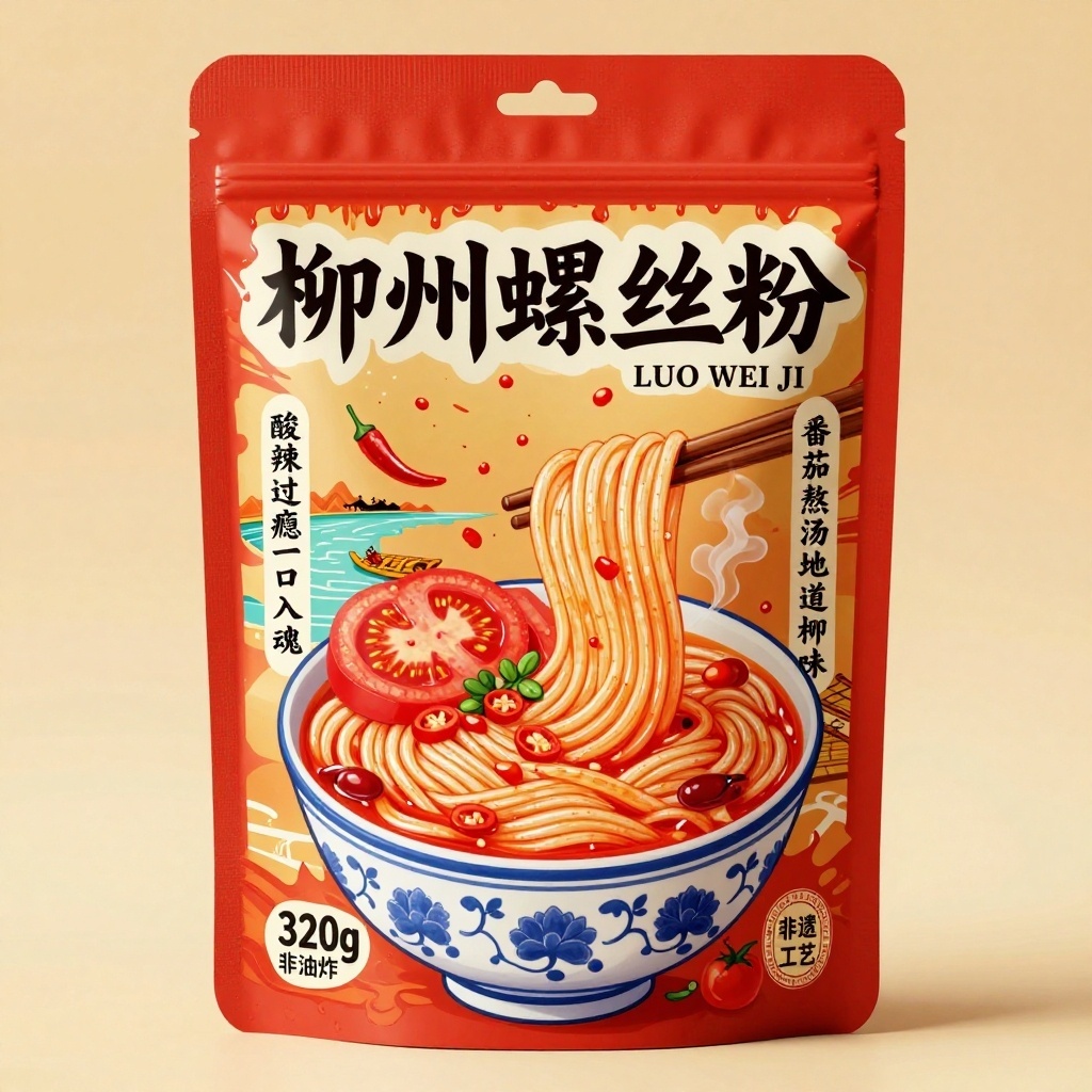产品:柳州螺丝粉;品牌名:螺味记;包装样式:食品自立袋,采用哑光覆膜牛皮纸材质,触感粗粝有食欲感;包装营销卖点:地道柳州酸辣鲜香,番茄浓汤灵魂提味;包装主视觉面排版:满版排版,一级文字“柳州螺丝粉”为飘逸书法体80pt,副标题“LUO WEI JI”为纤细衬线体20pt置于主标题右下方,二级文字宣传语1“酸辣过瘾一口入魂”+宣传语2“番茄熬汤地道柳州味”均为15pt手写圆体分列主图两侧,三级文字净含量“320g”及“非油炸”图标置于左下角;设计元素图案:背景层为泼溅状番茄红酱汁肌理,主图案为工笔风描绘的晶莹米粉缠绕于青花瓷碗中、上方堆叠爆浆番茄切片与辣椒圈,装饰图案含飞溅辣椒籽、蒸汽线条与柳江竹筏剪影,小图标为火焰形“辣度三星”与番茄藤蔓环绕的“非遗工艺”徽章;设计风格:新国潮手绘融合市井烟火气;主题配色:主色正红辅色金橙。