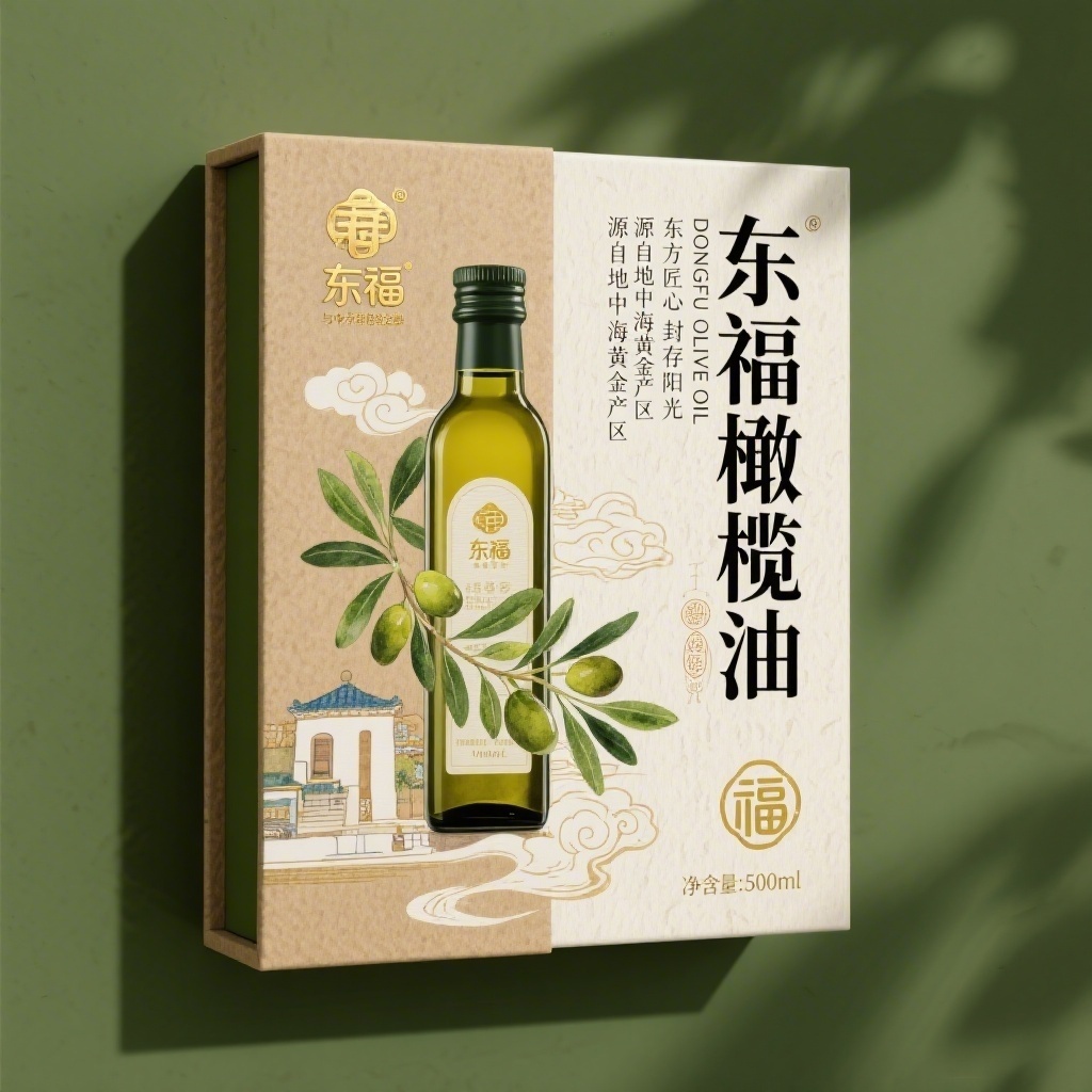 产品:特级初榨橄榄油;品牌名:东福;包装样式:长方形玻璃瓶+纸质标签,哑光牛皮纸材质带自然纤维纹理;包装营销卖点:以“地中海阳光与东方福韵交融”为核心概念,突出原料产地与品牌文化融合;包装主视觉面排版:左右排版,左侧为东福logo竖排烫金工艺,右侧主标题“东福橄榄油”黑体粗字48pt,副标题“DONGFU OLIVE OIL”衬线体12pt,宣传语1“源自地中海黄金产区”+宣传语2“东方匠心封存阳光”无衬线体8pt,净含量“500ml”置于右下角图标内;设计元素背景层为浅米色肌理纸纹,主图案采用水彩天然风绘制橄榄枝缠绕中式祥云,装饰图案含微缩地中海建筑剪影与书法笔触飞白,小图标为金色橄榄果轮廓与福字印章组合;设计风格:新中式轻奢混搭地中海田园;主题配色:主色橄榄绿+辅色暖沙金。
