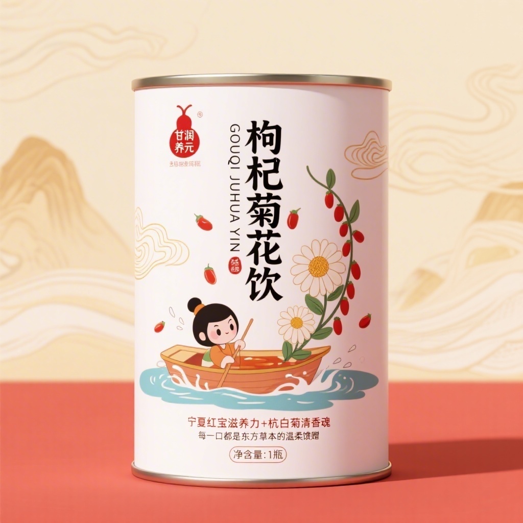 产品:枸杞菊花饮;品牌名:大战场;包装样式:马口铁罐装,纸面覆哑光膜呈现温润触感;包装营销卖点:核心产区直采,自然之选安心饮;包装主视觉面排版:覆盖式排版,主标题“枸杞菊花饮”竖向黑体粗字48pt居中压盖图案,副标题拼音“GOUQI JUHUA YIN”10pt贴底对齐,二级文字“宁夏红宝滋养力+杭白菊清香魂”与“每一口都是东方草本的温柔馈赠”分列左上与右下8pt宋体,净含量“1瓶”标于罐底边线中央,圆形图标“自然之选·核心产区”悬浮于主标题左侧;设计元素图案:背景层为流动状米黄水墨云纹,主图案改为扁平卡通风“枸杞小仙乘菊瓣舟泛于茶汤湖”,舟尾溅起水花化作菊花瓣,装饰图案含环绕飞舞的枸杞果串与菊叶波浪纹,小图标为朱砂色葫芦形“甘润养元”篆章;设计风格:新国潮美学扁平化卡通;主题配色:白色基底搭配米黄色与朱砂红。