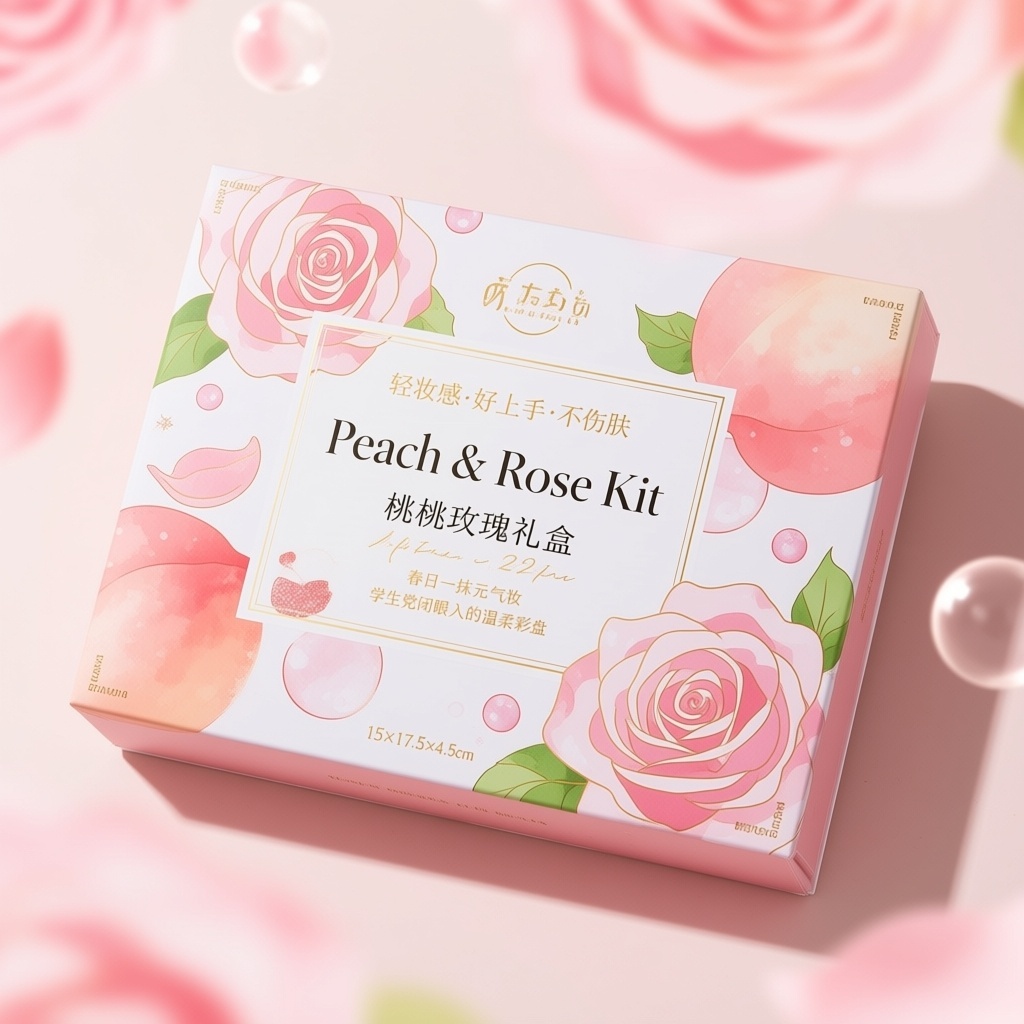 产品:颜序坊Peach & Rose Kit桃桃玫瑰礼盒;品牌名:YANXU LAB 颜序坊;包装样式:15×17.5×4.5cm长方体精品礼盒,哑光棉柔纸+局部烫金,圆角配浅粉丝绒绑带;包装营销卖点:“轻妆感·好上手·不伤肤”主打学生党无压力美妆入门;包装主视觉面排版:居中满版排版,主标题“Peach & Rose Kit”纤雅黑体30pt叠于中央,副标题“桃桃玫瑰礼盒”手写连笔体22pt紧贴其下,宣传语“春日一抹元气妆”“学生党闭眼入的温柔彩盘”6pt分列标题上下形成呼吸框,背景层为柔焦水彩风蜜桃与玫瑰交融绽放,花瓣随风悬浮于奶白雾面底,主图案采用低饱和插画风格,点缀极细金线勾边气泡与闪粉粒子,四角嵌唇釉/腮红/眼影线稿小标;设计风格:参考花洛里亚的柔光留白美学,融合少女元气与春日治愈,构图优雅不拥挤;主题配色:蜜桃粉+玫瑰浅粉为主,奶白+浅金为辅。
