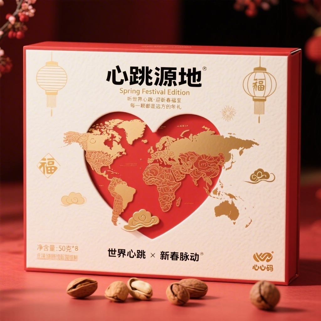 产品:「心跳源地」坚果礼盒·新春限定;品牌名:FREE人;包装样式:30×20×10cm长方形精品礼盒,哑光再生纸材质触感温润细腻;包装营销卖点:以“世界心跳×新春脉动”为核心,用立体爱心融合世界地图与祥云纹,传递全球团圆祝福;包装主视觉面排版:上下排版,主标题“心跳源地”黑体60pt居上,副标题“Spring Festival Edition”细线体12pt烫金,二级宣传语“听世界心跳·迎新春福至”+“每一颗都是远方的年礼”思源黑体10pt分列爱心下方两侧,三级文字含净含量50g×8及“低温锁鲜”图标;背景层为自然米白肌理纸基底,主图案是工笔风立体爱心浮雕内嵌世界地图线稿与水墨祥云交融,装饰图案为四角极简梅花/灯笼/福字/祥云金色线描,小图标含右下角1.5cm心跳波纹“心心码”及暗褐凸印坚果轮廓群;设计风格:极简人文主义融合东方节庆美学,克制烫金不喧宾夺主;主题配色:心跳红+福字金。