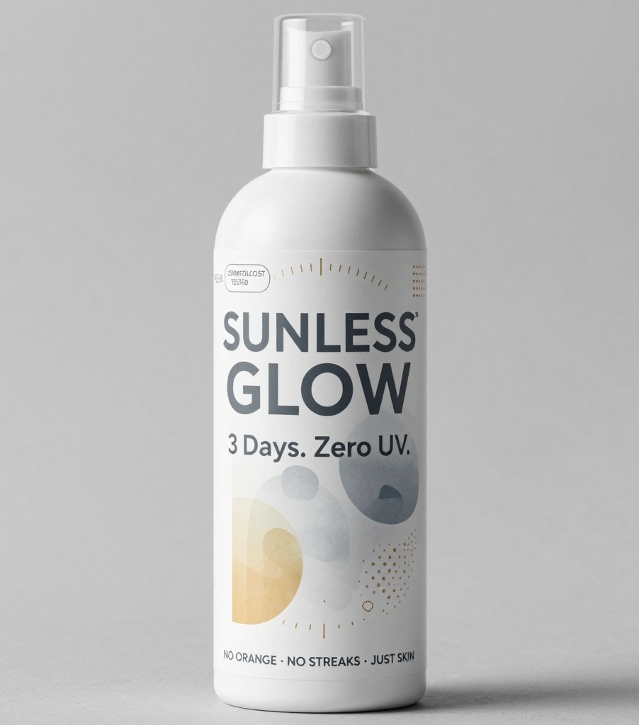 产品:美黑喷雾;品牌名:SunKissed Glow;包装样式:纯白塑料瓶身配透明瓶盖,瓶体贴覆哑光PET不干胶标签;包装营销卖点:以“三天自然显色·无橘无纹”为视觉核心,打造极简高信噪比信息排版;包装主视觉面排版:覆盖式排版,主标题“SUNLESS GLOW”超粗无衬线体48pt居中压印于全幅水彩晕染肌理之上,副标题“3 Days. Zero UV.”细等线体10pt悬于其下,宣传语“NO ORANGE · NO STREAKS · JUST SKIN”三组词以6pt微距横向排列于瓶底弧线处;背景层为低饱和灰调仿晒后肌肤纹理,主图案采用抽象几何风将卡卡杜李切片转化为渐变圆形色块沿瓶身纵向分布,装饰图案含极细金色日晷刻度线与维生素分子结构点阵,小图标“DERMATOLOGIST TESTED”与“VEGAN”以胶囊形框体嵌于左上角;设计风格:现代机能美学+信息可视化排版;主题配色:主色雾灰,辅色钛金。