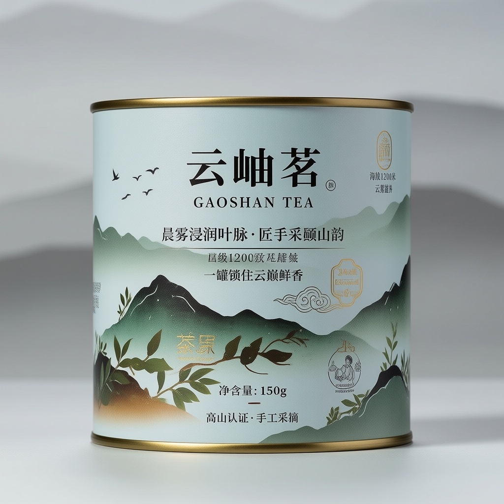 产品:台湾高山茶;品牌名:云岫茗;包装样式:圆形马口铁罐装,哑光金属质感;包装营销卖点:以“海拔1200米云雾滋养”为核心,突出高山原生环境与手工采摘工艺;包装主视觉面排版:上下排版,主标题“云岫茗”雅黑粗体48pt居上,副标题“GAOSHAN TEA”衬线体12pt,二级文字“晨雾浸润叶脉·匠手采撷山韵”+“一罐锁住云巅鲜香”无衬线体8pt,三级文字“净含量:150g”及“高山认证·手工采摘”图标;背景层为淡雾灰渐变模拟山岚,主图案采用工笔风绘制层叠山峦与茶树枝叶,细节处露珠晶莹,装饰图案含飘逸云纹与飞鸟剪影,小图标为手绘采茶女轮廓与海拔数字徽章;设计风格:东方极简融合自然写意;主题配色:主色雾霭青灰,辅色茶汤琥珀。