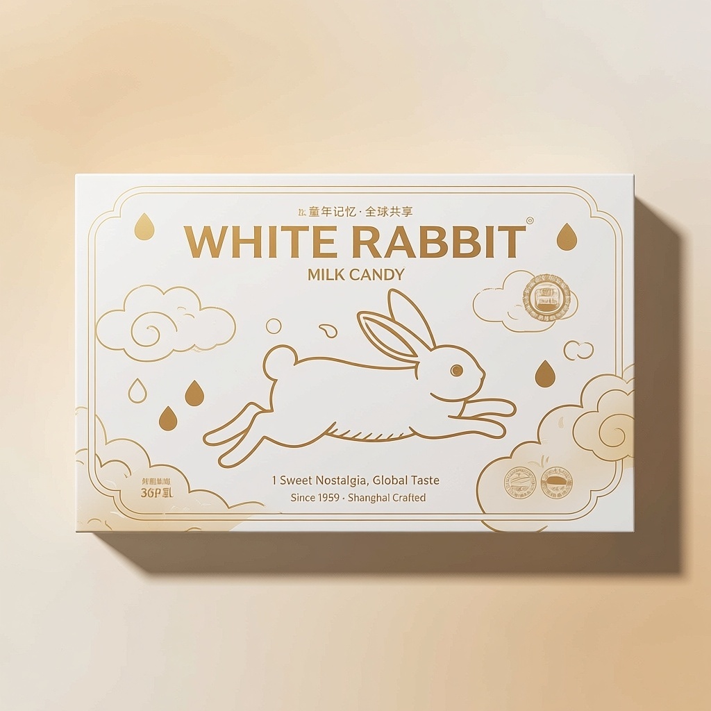 产品:大白兔奶糖;品牌名:大白兔(保留经典LOGO);包装样式:长方形精品礼盒,选用哑光珠光纸材质,触感温润细腻;包装营销卖点:以“童年记忆·全球共享”为核心,将经典兔子形象转化为极简线条插画,融合东方留白美学与国际扁平设计语言;包装主视觉面排版:采用满版排版,主标题“WHITE RABBIT”使用无衬线粗体字36pt居中,副标题“MILK CANDY”小写12pt置于其下,宣传语1“Sweet Nostalgia, Global Taste”与宣传语2“Since 1959 · Shanghai Crafted”分列左右8pt;背景层为米白渐变晕染,主图案为单线勾勒的侧身跳跃兔形,风格为极简水墨线描风,辅以散落云纹与奶滴抽象图形,装饰线条为浅金细弧线环绕四角,小图标含“纯牛乳”“无添加”双语认证徽章;设计风格:新中式极简主义,融合海派文化基因与当代视觉语法;主题配色:主色奶霜白、辅色浅琥珀金。