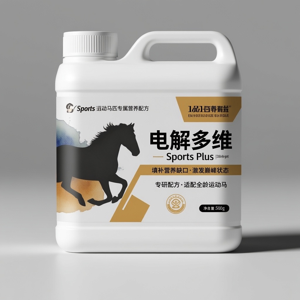 产品:电解多维(Sports Plus)马用营养补充剂;品牌名:Sports Plus;包装样式:白色方形塑料桶瓶标,哑光覆膜不干胶材质,触感细腻抗刮;包装营销卖点:以“运动马匹专属营养配方”为核心,突出生物素+赖氨酸+蛋氨酸黄金三角组合提升竞技表现;包装主视觉面排版:采用左右排版,左侧为写实风格骏马奔跑剪影叠加水彩肌理背景,右侧主标题“电解多维”粗黑体36pt+英文“Sports Plus”无衬线体18pt,下方二级宣传语“填补营养缺口·激发巅峰状态”“专研配方·适配全龄运动马”各9pt,底部净含量图标含“500g”字样;设计元素含金色流线型装饰带贯穿马身、维生素分子结构抽象小图标群组、桶底环形营养成分放射纹;设计风格:现代极简融合运动美学,线条锐利与柔润渐变并存;主题配色:深空灰+琥珀金。