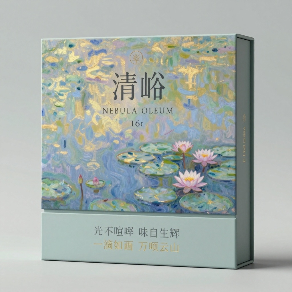 产品:高端有机山茶油;品牌名:清峪;包装样式:长方形精品礼盒,选用进口棉麻混织艺术纸,哑光雾面带细微手工纹理;包装营销卖点:以莫奈《睡莲》的氤氲光晕为魂,演绎“光驻瓶中·静养千年”的东方极简贵气美学;包装主视觉面排版:上下排版,主标题“清峪”采用极细宋体78pt居顶悬浮,副标题“NEBULA OLEUM”衬线体16pt轻落其下,宣传语1“光不喧哗 味自生辉”与宣传语2“一滴如画 万顷云山”分列底部留白处,字号5pt灰金微凸印;设计元素图案背景层为宣纸肌理透叠淡青灰水色晕染,主图案是抽象水墨风睡莲轮廓,仅三笔柔弧勾出花瓣投影,风格为空灵新水墨写意,装饰图案含右上角极淡金箔涟漪纹与左下角微型篆刻图标“雲霧初搾”,无多余线条,全靠负空间与材质呼吸感营造贵气;设计风格:东方静奢极简主义;主题配色:主色雾霭青灰,辅色月影金。
