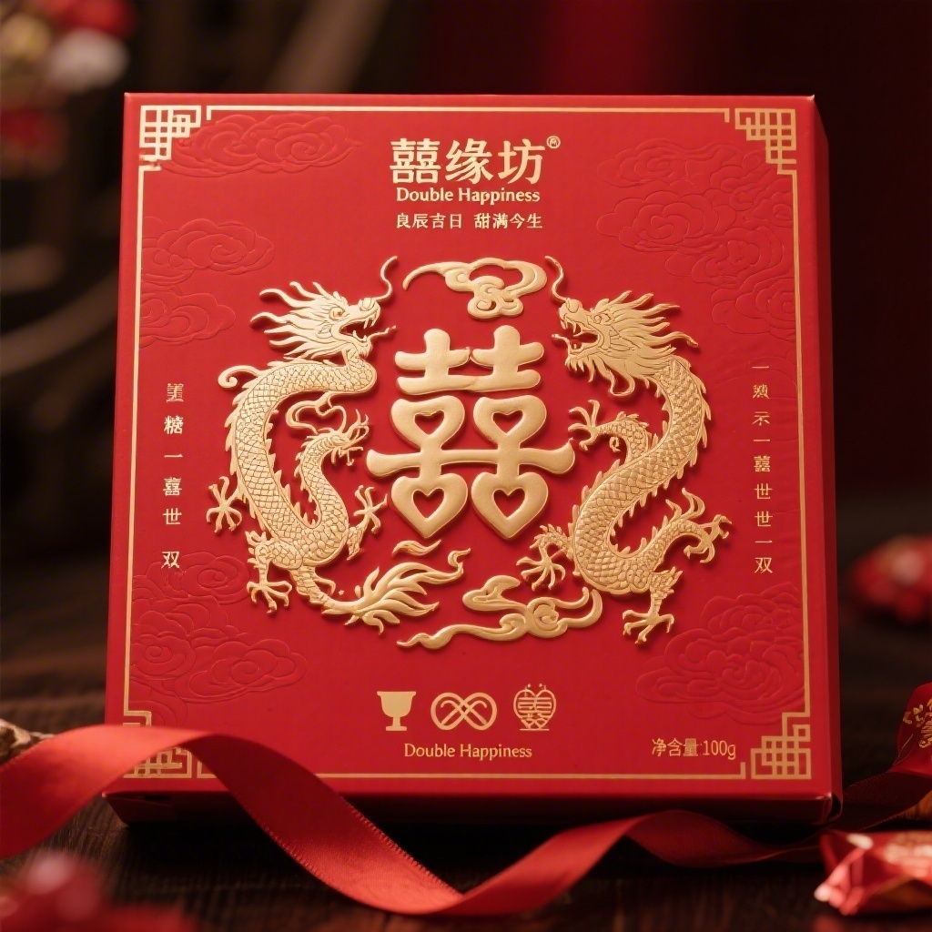 产品:中式喜糖;品牌名:囍缘坊;包装样式:长方形精品礼盒,选用哑光红金卡纸材质,触感细腻温润;包装营销卖点:以传统“囍”字为核心视觉符号,融合龙凤呈祥纹样传递婚庆吉祥寓意;包装主视觉面排版:上下排版,主标题“囍缘坊”楷体烫金60pt居上,副标题“Double Happiness”衬线体12pt,二级宣传语1“良辰吉日 甜满今生”+宣传语2“一糖一囍 一世一双”宋体8pt分列两侧,净含量“100g”置于右下角;背景层为暗红底压印云纹肌理,主图案采用工笔风金线勾勒龙凤环绕中央立体浮雕“囍”字,四角装饰回形纹鎏金边框,底部飘带式色块承载品牌英文,小图标含合卺杯、同心结等婚庆符号;设计风格:新中式典雅风,融合传统婚俗美学与现代简约布局;主题配色:朱砂红配香槟金。