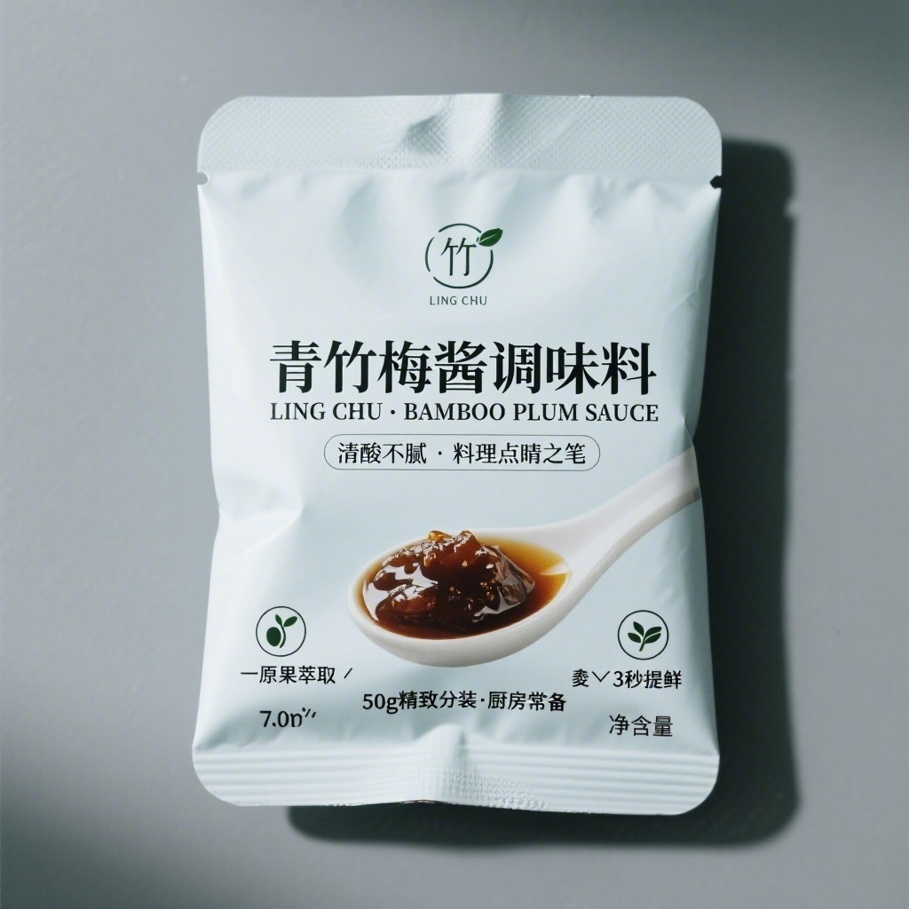 产品:青竹梅酱调味料;品牌名:箖初;包装样式:食品自立袋,采用哑光珠光纸复合膜,触感细腻带微光泽;包装营销卖点:以“一勺唤醒山野鲜”提炼自然本味与极简生活主张;包装主视觉面排版:采用以文字为主式排版,主标题“青竹梅酱调味料”无衬线粗体50pt居中压阵,副标题“LING CHU · BAMBOO PLUM SAUCE”轻量衬线10pt悬于其下;二级文字“清酸不腻·料理点睛之笔”+“50g精致分装·厨房常备”,细黑体7pt分列标题两侧;三级文字含净含量及图标“🌱原果萃取”“⏱️3秒提鲜”。背景层为留白基底搭配极淡灰绿竖向水墨肌理,主图案是抽象线稿风青竹剪影从底部斜逸而上,仅三枝两果,线条纤细有呼吸感;装饰图案含右上角飘落单枚水彩梅瓣,左下角嵌圆形极简图标章;小图标采用负空间设计;设计风格:现代极简图文构成风,强调字体张力与负空间节奏;主题配色:主色雾霭青灰、辅色素白。