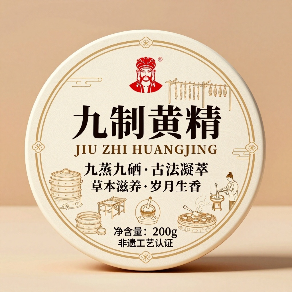 产品:九制黄精;品牌名:颐养本草;包装样式:圆形瓶标,尺寸6.5×6.5厘米,选用哑光铜版纸材质触感温润;包装营销卖点:以“古法九蒸九晒”工艺为核心视觉符号,传递匠心传承与养生价值;包装主视觉面排版:采用满版排版,一级文字“九制黄精”楷体加粗36pt居中,“JIU ZHI HUANGJING”英文衬线体12pt置于其下;二级文字“九蒸九晒·古法凝萃”+“草本滋养·岁月生香”黑体8pt分列上下;三级文字“净含量:200g”及“非遗工艺认证”图标置于底部。背景层为米白宣纸肌理,主图案为工笔风格插画呈现蒸笼、晾晒架、药碾等九道工序场景,边缘饰以缠枝纹浅金描边,四角点缀云纹小图标;设计风格:新中式典雅风,融合传统工笔与现代极简排版;主题配色:主色象牙白,辅色浅赭石。