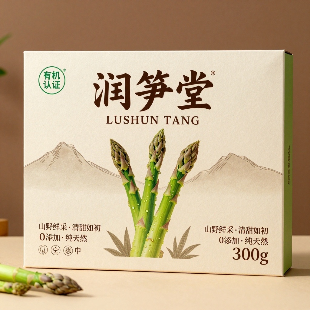 产品:芦笋;品牌名:润笋堂;包装样式:长方形精品礼盒,采用哑光环保牛皮纸材质,触感温润质朴;包装营销卖点:源自高山生态种植,每一根都饱含自然馈赠;包装主视觉面排版:上下排版,主标题“润笋堂”为手写体粗字48pt居上,副标题“LUSHUN TANG”衬线体12pt,二级文字“山野鲜采·清甜如初”+“0添加·纯天然”各8pt分列下方两侧,净含量“300g”置于右下角图标内;设计元素图案:背景层为米色肌理纸纹模拟土地质感,中央主图案为工笔风三支带露水芦笋斜倚山脉轮廓前,山脉以极细墨线勾勒呈淡棕晕染,底部散落芦笋叶剪影作装饰图案,左上角嵌入绿色圆形小图标内书“有机认证”;设计风格:简约自然风;主题配色:主色嫩芽绿、辅色暖棕褐。