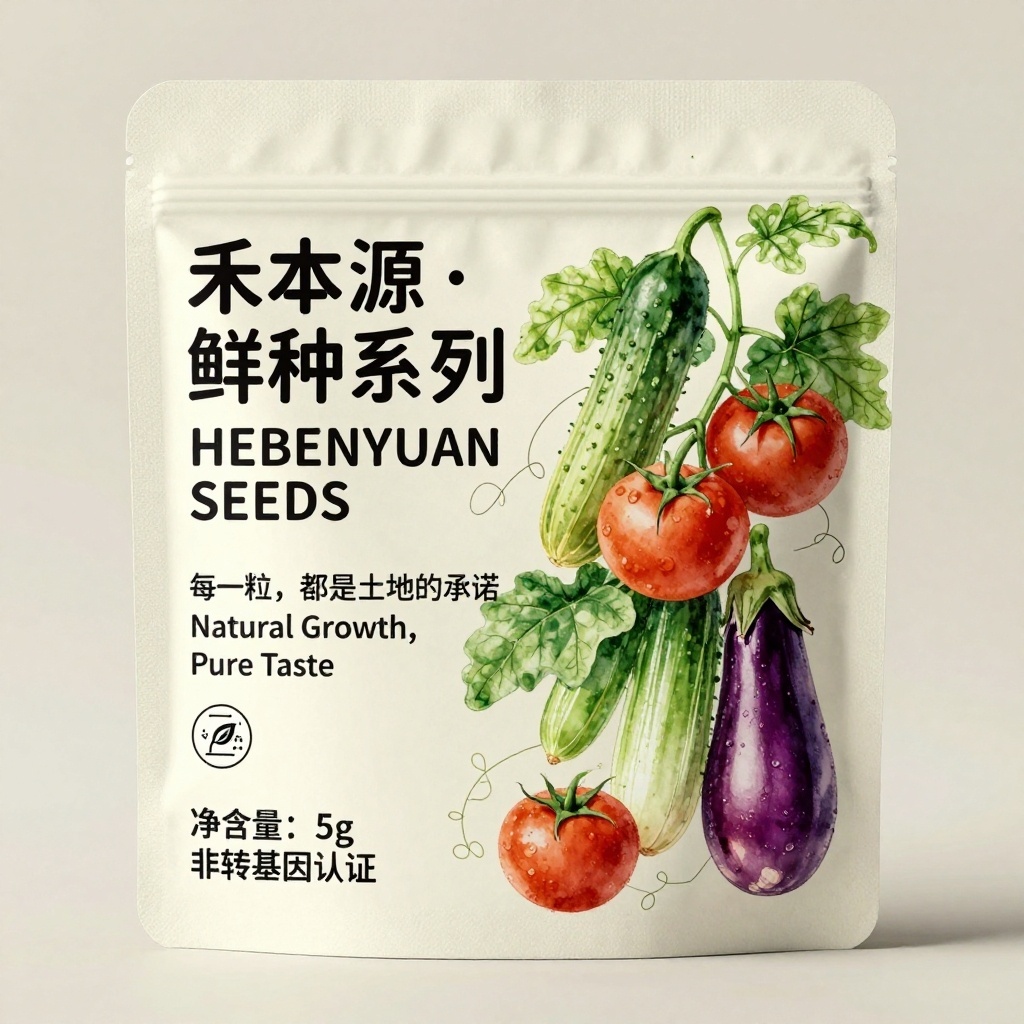 产品为黄瓜、番茄、青菜、茄子种子;品牌名为“禾本源”;包装样式为三边封软包装,采用哑光环保复合膜材质,触感柔韧细腻;包装营销卖点以“从种子到餐桌的自然之美”为核心,强调原生植株与果实的真实形态传递健康种植理念;包装主视觉面排版采用左右排版(文字在左图案在右),一级文字主标题为中文“禾本源·鲜种系列”,副标题为拼音“HEBENYUAN SEEDS”,字体为无衬线黑体28pt;二级文字宣传语1“每一粒,都是土地的承诺”+宣传语2“Natural Growth, Pure Taste”,字号6pt;三级文字含净含量“净含量:5g”及“非转基因认证”图标内文案;设计元素背景层为低饱和度米白肌理纸纹,主图案为写实水彩天然风绘制的对应蔬菜果实与叶片组合,装饰图案含极细藤蔓线条缠绕于图文间隙,小图标为叶形有机认证标与播种月历提示符;设计风格为现代简约融合自然主义美学;主题配色主色为苔藓绿+辅色陶土棕。