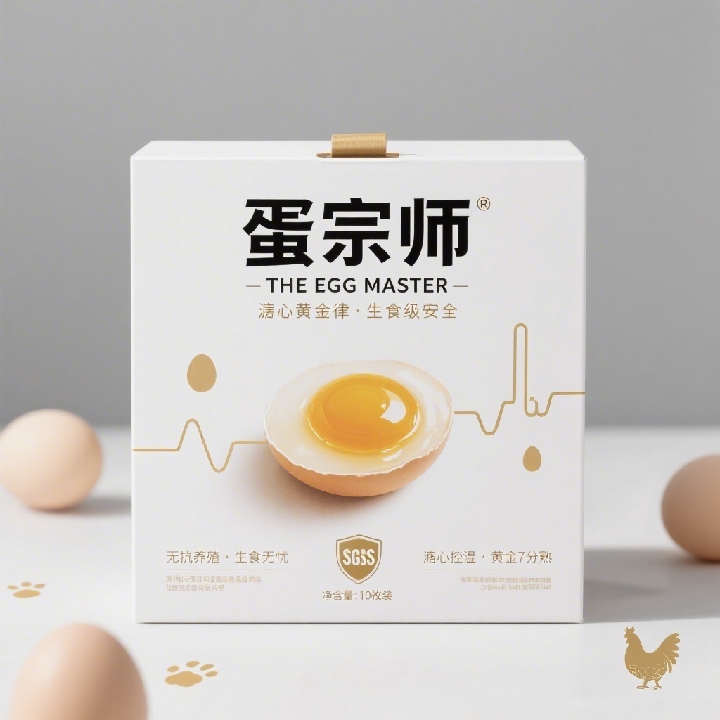产品:鸡蛋;品牌名:蛋宗师;包装样式:上盖下扣礼盒,选用柔韧珠光纸材质,表面微闪如蛋壳光泽;包装营销卖点:以“溏心黄金律·生食级安全”为核心,融合供港标准与可生食认证构建高端信任符号;包装主视觉面排版:采用上下排版,顶部主标题“蛋宗师”黑体56pt配衬线英文副标“THE EGG MASTER”10pt,底部居中放置写实溏心蛋主图,两侧对称排布二级文案“无抗养殖 · 生食无忧”与“溏心控温 · 黄金7分熟”楷体8pt,净含量“10枚装”与盾形“SGS认证”图标嵌于蛋图下方;设计元素:背景层为雾灰白底色,中央溏心蛋以工笔风绘制,蛋黄呈熔岩金质感、蛋白晶莹透亮,四周散落极简蛋形辅助图形与温度曲线装饰线,角落点缀金色鸡爪印小图标象征源头可溯;设计风格:安全、简约、高端、辨识度高;主题配色:主色雾灰白,辅色熔岩金。