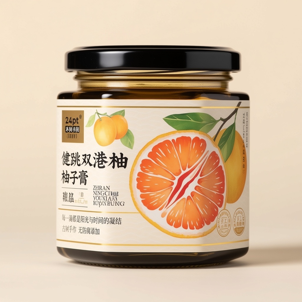 产品:古树利膏;品牌名及宣传语:健跳双港柚子膏|自然凝萃 柚香润养;包装样式:圆形玻璃瓶+环绕式纸质标签,标签采用80g哑光艺术纸,触感温润细腻;包装营销卖点:以原产地双港古树柚为视觉核心,强调“手工熬制、零添加”的天然工艺价值;包装主视觉面排版:左右排版,左侧竖排主标题“健跳双港柚子膏”书法体24pt+副标题拼音“ZIRAN NINGCUI YOUXIANG RUNYANG”细宋体10pt,下方接宣传语“每一滴都是阳光与时间的凝结”“古树手作 无防腐添加”各6pt,右侧满幅水彩风柚子切片图案占据70%版面,果肉晶莹透亮、枝叶舒展自然,背景层铺浅米色纸纹,装饰层含手绘柚皮肌理底纹与0.5mm金色极细分隔线贯穿上下,右下角嵌“无添加”“手工熬制”双徽章图标直径1.2cm;设计风格:自然简约融合轻手绘质感;主题配色:橘黄 + 浅卡其。