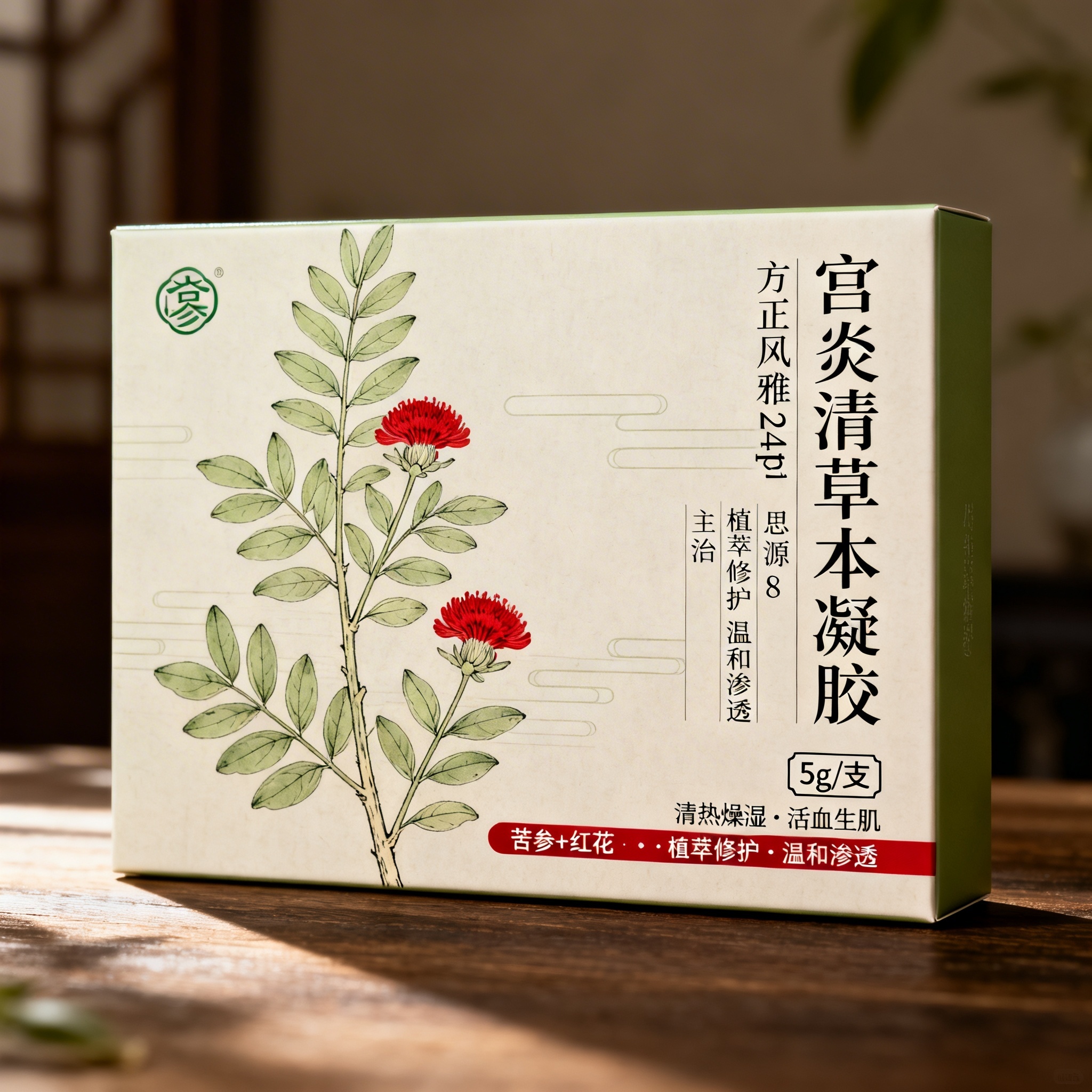 产品:宫炎清草本凝胶;品牌名:宫炎清;包装样式:长方形精品礼盒,选用柔韧哑光白卡纸,触感温润洁净,边角圆润处理;包装营销卖点:以“苦参+红花”双植萃为核心视觉符号,传递专业、天然、温和的妇科护理信赖感;包装主视觉面排版:左右排版,左侧为工笔简约线稿——浅橄榄绿苦参枝叶纵向舒展,三朵朱砂红花蕊轻缀其间,背景层为极淡米宣肌理,无装饰线条;右侧竖排主标题“宫炎清草本凝胶”方正风雅宋24pt,下方功效与主治分两段思源宋体8pt,底部“5g/支”加框图标思源黑体7pt;二级宣传语“清热燥湿 · 活血生肌”+“植萃修护 · 温和渗透”均为思源宋体5pt;设计风格:东方药典极简风;主题配色:浅橄榄绿+朱砂红。