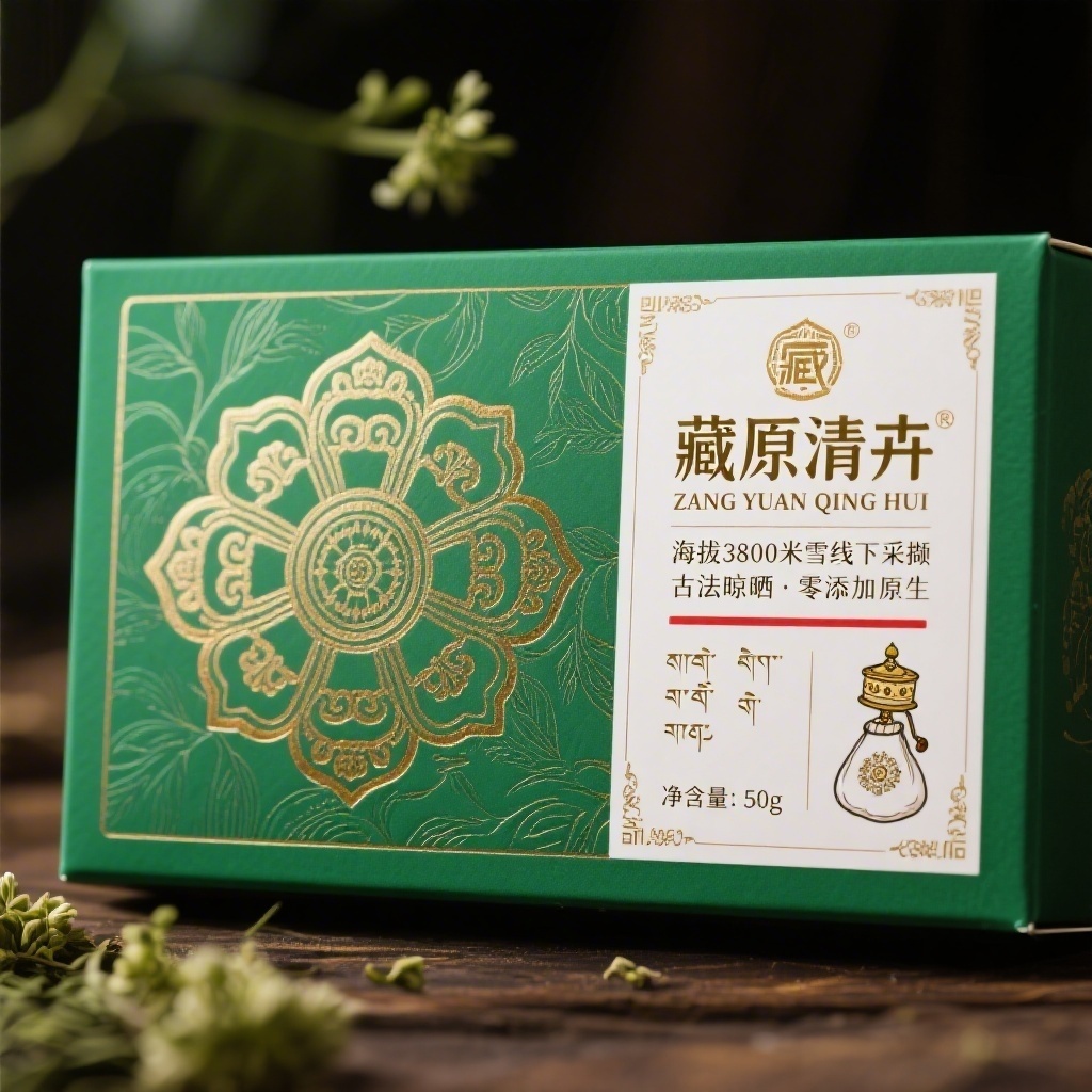 产品:绿萝花;品牌名:藏原清卉;包装样式:长方形铜版纸不干胶贴纸,20cm×5cm,纸面微哑柔韧;包装营销卖点:藏地高原草本智慧,以宗教纹饰传递纯净能量;包装主视觉面排版:左右排版,左侧翠绿底压印浅金蔓草浮雕暗纹,中央鎏金粗粝线稿风八吉祥纹构成视觉锚点,右侧哑白矩形文字区主标题“藏原清卉”藏汉双语粗宋体32pt,副标题拼音“ZANG YUAN QING HUI”8pt,二级宣传语“海拔3800米雪线下采撷”+“古法晾晒·零添加原生”各6pt纵向排列,三级文字“净含量:50g”与手绘药囊、转经轮图标置于右下角;装饰含朱砂红渐变分割线、散落六字真言符码及边角回纹;设计风格融合藏传符号美学与现代信息层级逻辑;主题配色:翠绿+鎏金。
