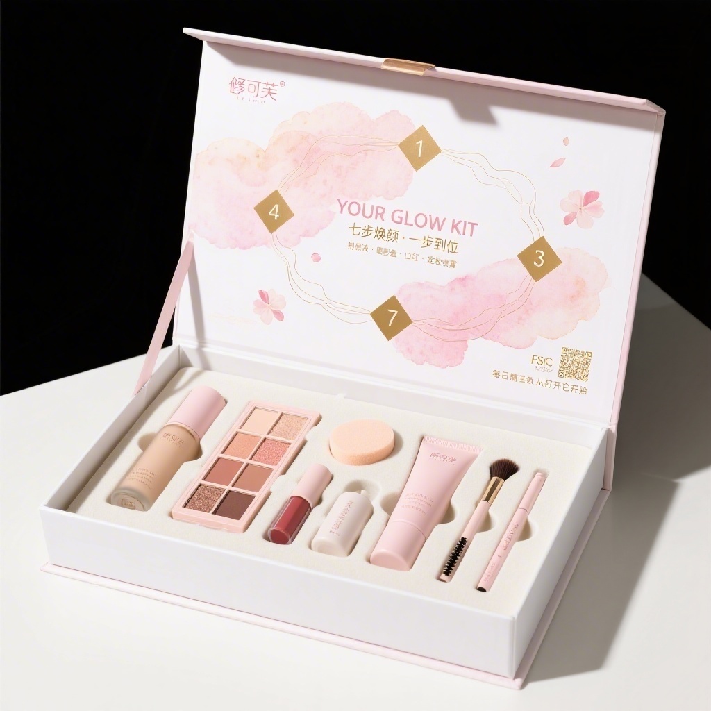 产品:修可芙美妆礼盒内含七件套;品牌名:修可芙;包装样式:精品礼盒开盖展示层,内托采用柔雾白植绒材质衬底,凹槽精准嵌入单品;包装营销卖点:以“七步焕颜仪式”构建开盒即享的精致体验感;包装主视觉面排版:满版排版,中央横向陈列七件产品实拍图,上方裸粉色无衬线体主标题“YOUR GLOW KIT”字号24pt,下方微光金衬线体中文副标“七步焕颜·一步到位”18pt;二级文字左下角“粉底液·眼影盘·口红·定妆喷雾·粉扑·刷具·眉笔”裸粉9pt竖列排布,右下角加烫金小字“每日精致从打开它开始”;三级文字含FSC环保标与官网二维码;设计元素背景为水彩晕染云纹肌理,主图案为手绘风格化妆品轮廓线稿环绕产品四周,装饰图案含烫金菱形符号与飘散花瓣,小图标为极简数字序号1-7标注每件物品;设计风格:水彩天然风融合轻奢留白美学;主题配色:柔雾白+微光金。