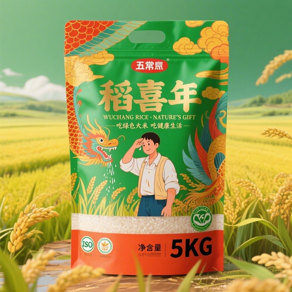 产品:五常大米;品牌名:稻喜年;包装样式:OPP材质自立米袋,高亮彩印哑光覆膜触感柔韧;包装营销卖点:手绘农人汗水浇灌五常沃土,鲜艳龙鳞凤羽环绕稻浪传递丰收喜悦;包装主视觉面排版:覆盖式排版,主标题“稻喜年”粗圆体52pt烫金居中压于农人肩侧,副标题“WUCHANG RICE · NATURE’S GIFT”衬线10pt贴底边,宣传语“吃绿色大米 吃健康生活”手写风8pt横贯腰线,净含量“5KG”黑体加粗26pt置于右下角,绿色食品标与五常地理标并列嵌于手扣下方,ISO图标缩于左下角;设计元素图案:背景层为饱和黄绿渐变稻田俯视肌理,主图案是夸张卡通风年轻农民卷袖擦汗立于中央,身后水稻随风涌动,装饰图案含抽象化龙鳞云纹与凤凰尾羽缠绕袋角,小图标含三认证标识及稻穗计量章;设计风格:民俗插画混搭潮流撞色美学;主题配色:翠绿主色配橙红辅色。