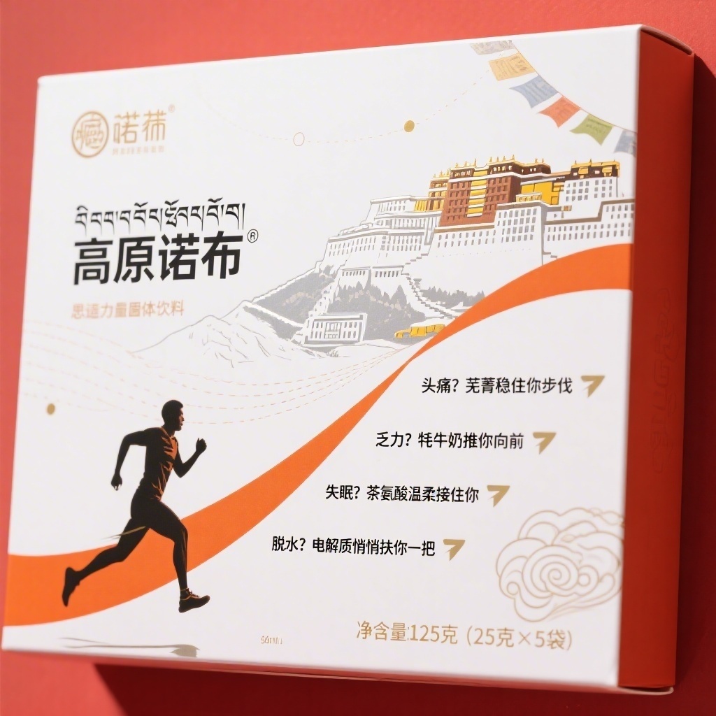 产品:高原能量固体饮料;品牌名:高原诺布(藏文锐角体+圆润无衬线简体);包装样式:长方形精品礼盒,350g柔韧触感纸模拟登山服织物肌理,轻量抗磨;包装营销卖点:四句动态陪伴式文案——“头痛?芜菁稳住你步伐”“乏力?牦牛奶推你向前”“失眠?茶氨酸温柔接住你”“脱水?电解质悄悄扶你一把”,传递被高原力量舒适托举的安心感;包装主视觉面排版:左下至右上斜向图文流线排版,“高原诺布”双语斜置左上角(藏文26pt+汉字18pt微倾圆黑),中部沙棘橙气流弧线自左下托起奔跑者剪影(姿态松弛如被风助力),背景融入极简布达拉宫轮廓线描(雪山银烫印,仅显顶部金顶与错落窗棂),四行卖点沿人物动势悬浮排布(思源黑体Bold 14pt,句尾↑箭头图标哑金点缀),净含量“125克(25克×5袋)”9pt落于右下稳定锚点;背景层高原白,飘动经幡虚线与氧气波点构成上升韵律,盒底角藏式云纹演化为缓冲弹簧图形;设计风格:人文地标轻运动美学+空气动力图文叙事;主题配色:高原白 + 诺布红。