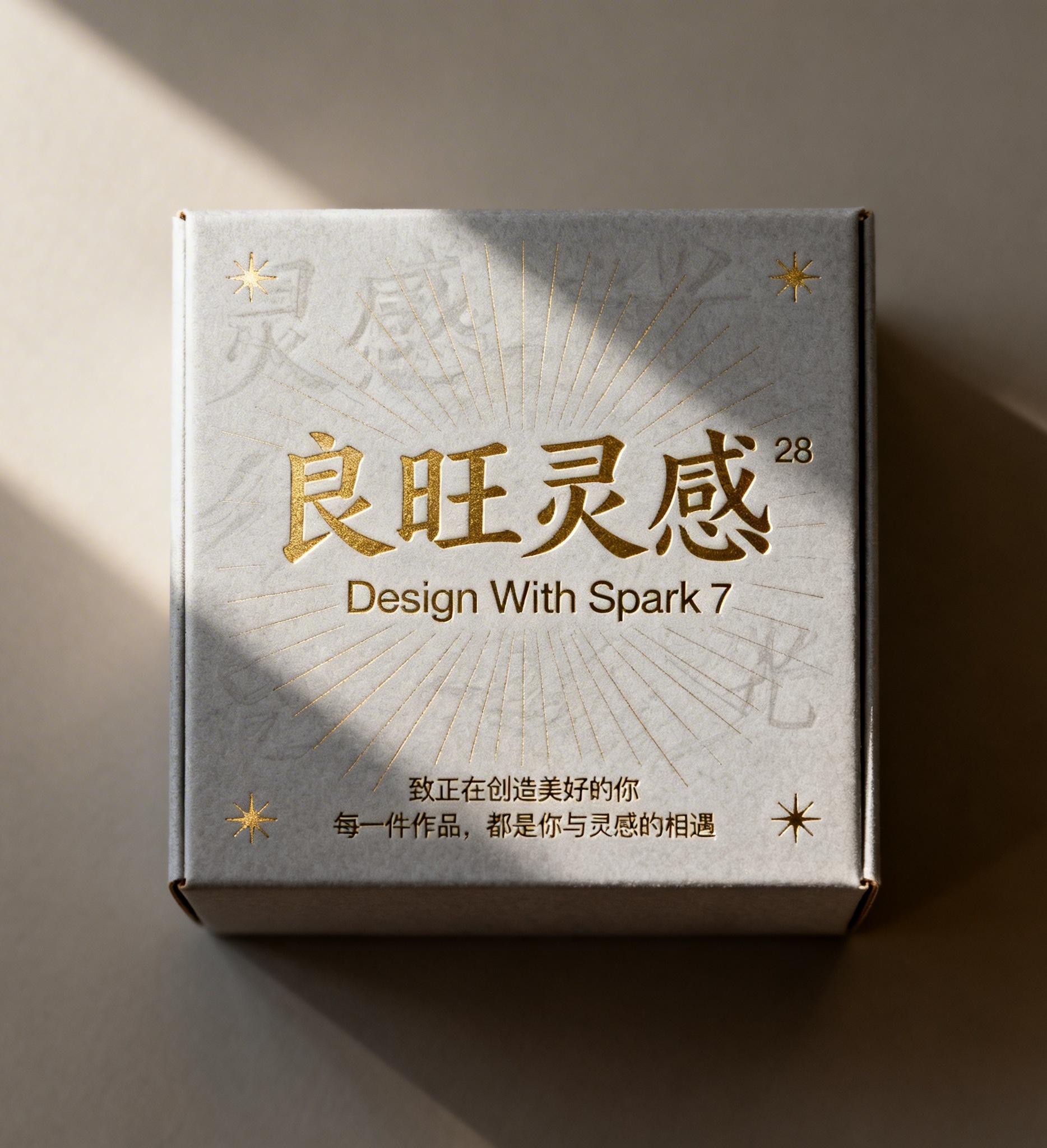 产品:良旺灵感系列手作饰品;品牌名:良旺灵感;包装样式:正方形精品礼盒,哑光浅米色特种纸裱350g灰板纸,触感柔软温润;包装营销卖点:以“设计师的创作展”为核心概念,通过抽象“灵感之光”极细发散弧线图形传递艺术灵感绽放感;包装主视觉面排版:覆盖式排版,中央烫金“良旺灵感”定制手写体主标题(28pt)+下方Helvetica Neue Light副标题“Design With Spark”(7pt),底部两行宣传语“致正在创造美好的你”+“每一件作品,都是你与灵感的相遇”(6pt),背景层为暖灰底色上若隐若现的香槟金色“灵感之光”弧线纹样,主图案采用极简抽象线稿风,四角点缀微小烫金星点图标,无装饰线条;设计风格:现代极简主义融合手作温度感,克制留白中透出手工精致度;主题配色:暖灰+香槟金。