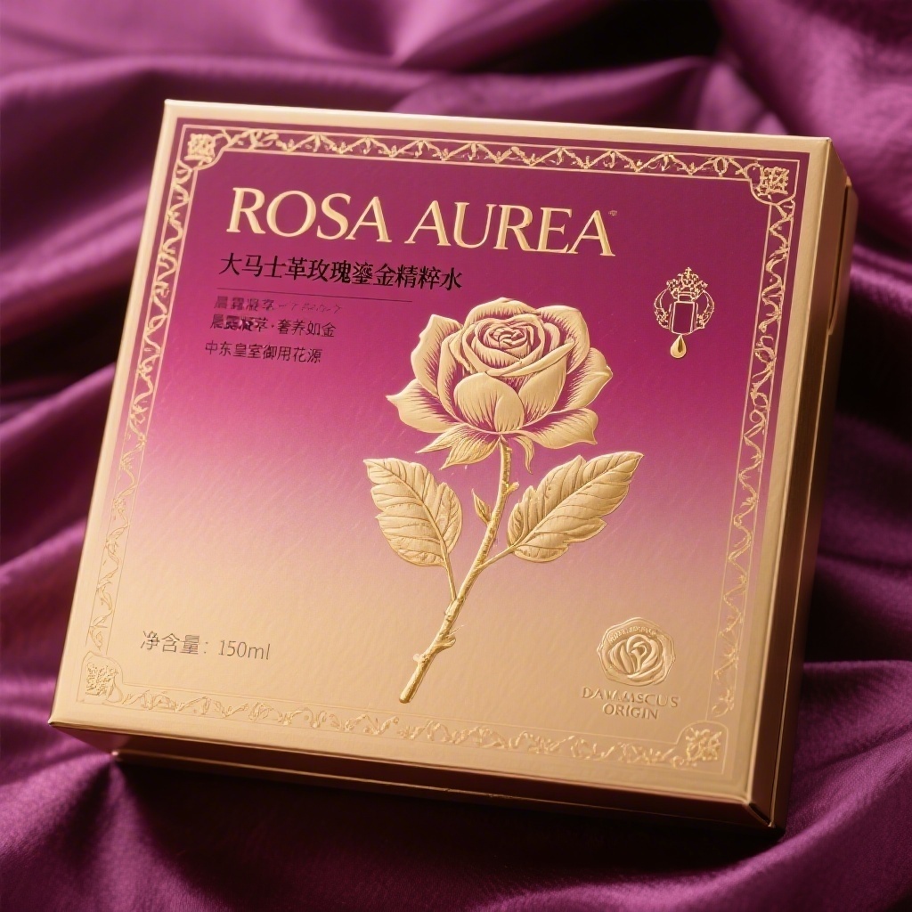 产品:大马士革玫瑰鎏金精粹水;品牌名:ROSA AUREA;包装样式:长方形精品礼盒,选用珠光压纹艺术纸,触感柔滑带金属光泽;包装营销卖点:萃取清晨带露玫瑰精华,一滴鎏金焕活肌底;包装主视觉面排版:上下排版,主标题“ROSA AUREA”居上,衬线体36pt鎏金色,副标题“大马士革玫瑰鎏金精粹水”黑体18pt深玫瑰红;二级文字宣传语1“晨露凝萃·奢养如金”与宣传语2“中东皇室御用花源”楷体8pt浅金灰;三级文字净含量“150ml”置于右下角,搭配玫瑰认证图标内文案“DAMASCUS ORIGIN”。背景层为渐变玫瑰金晕染,主图案采用工笔风手绘盛放玫瑰配鎏金叶脉,风格细腻典雅;装饰图案为阿拉伯藤蔓边纹烫金细线环绕四角,小图标含玫瑰徽章、滴管符号与皇室印章,均以浮雕工艺微凸呈现;设计风格:新古典轻奢主义,融合东方花卉美学与欧式鎏金装饰;主题配色:主色玫瑰鎏金,辅色暮紫绸缎。