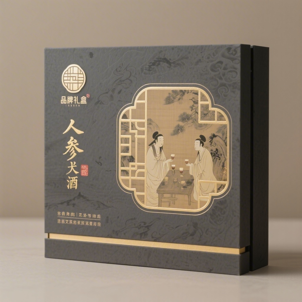 - **设计元素**:背景层为晕染式山水流云雅集水墨纹理,主图案为抽象化宋画人物祝酒场景,装饰图案含窗棂几何纹样作边框与角饰,装饰线条使用极细金线勾勒分隔区域,左上角设圆形窗棂标识徽章,底部合规文案区配浅金细线分隔条;材质选用哑光特种纸带细微宣纸肌理,触感温润古朴。