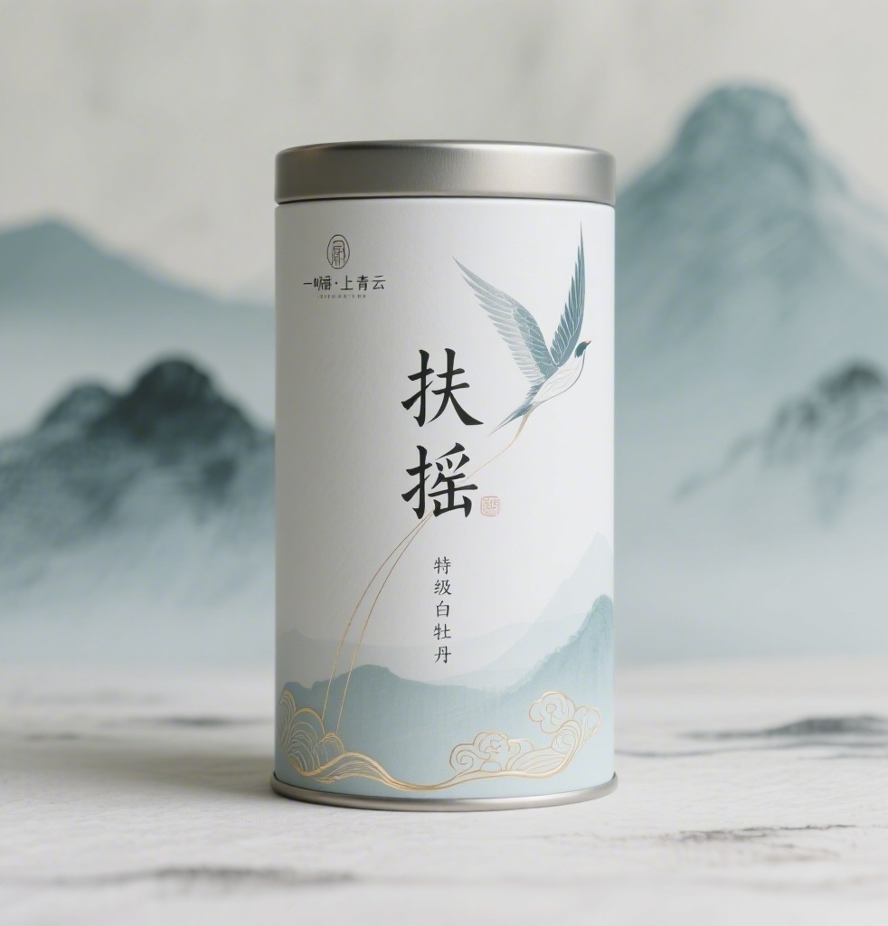 - **设计元素**:背景层为低饱和度宣纸肌理与朦胧山形水墨晕染;主图案为抽象化飞羽线条从罐底向上飘升,象征“扶摇”之意;装饰元素含纤细金线勾边云纹与叶脉暗纹;罐身哑光磨砂质感提升触觉高级感。
