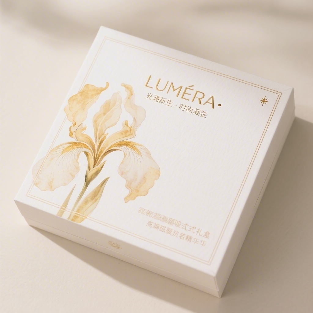 - **包装主视觉面排版**:覆盖式排版(主视觉花卉图案以半透明水彩质感衬于文字层下方,品牌名“LUMÉRA”居中偏上使用烫金立体字,宣传语分两行以纤细衬线体置于品牌名正下方,通过哑光白底色块强化文字可读性与高级感)