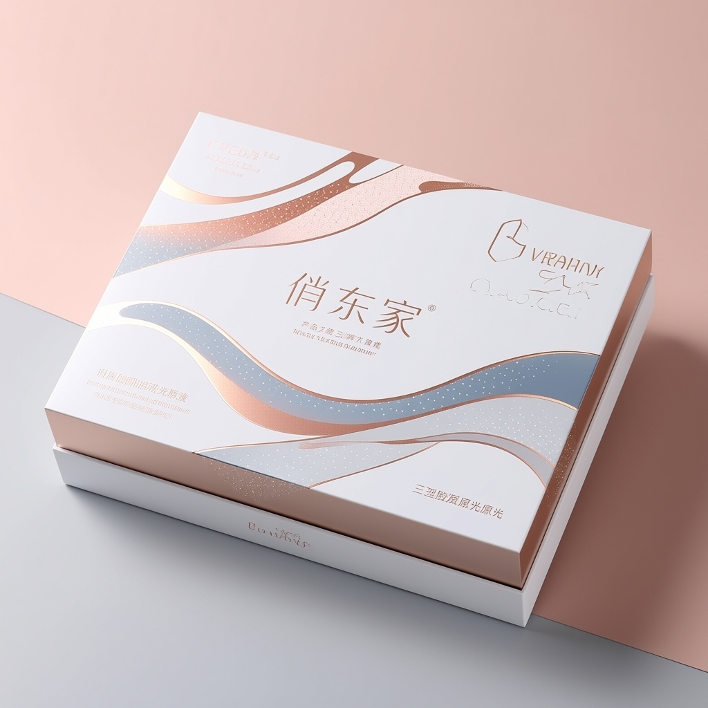 - **产品**:三型胶原肌光原液 - **品牌名**:俏东家 - **包装样式**:礼品盒 - **设计风格**:极简轻奢风 - **设计元素**:液态流动线条、微光粒子渐变、无衬线品牌字体排版、肌肤光泽质感底纹 - **主题配色**:珍珠白、玫瑰金、雾灰蓝