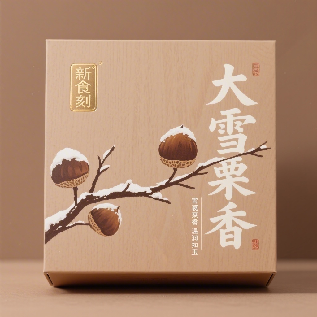 - **设计元素**:背景层为浅栗棕哑光磨砂柔面纸基,透浅木纹理;主图案为深咖色极简板栗枝线描与薄雪;文字元素为左侧金石印章“新食刻”与右侧隶书“大雪栗香”;无装饰边框或图标,仅靠印章、书法与自然线描构建视觉重心;局部印章边缘微烫银增强立体感