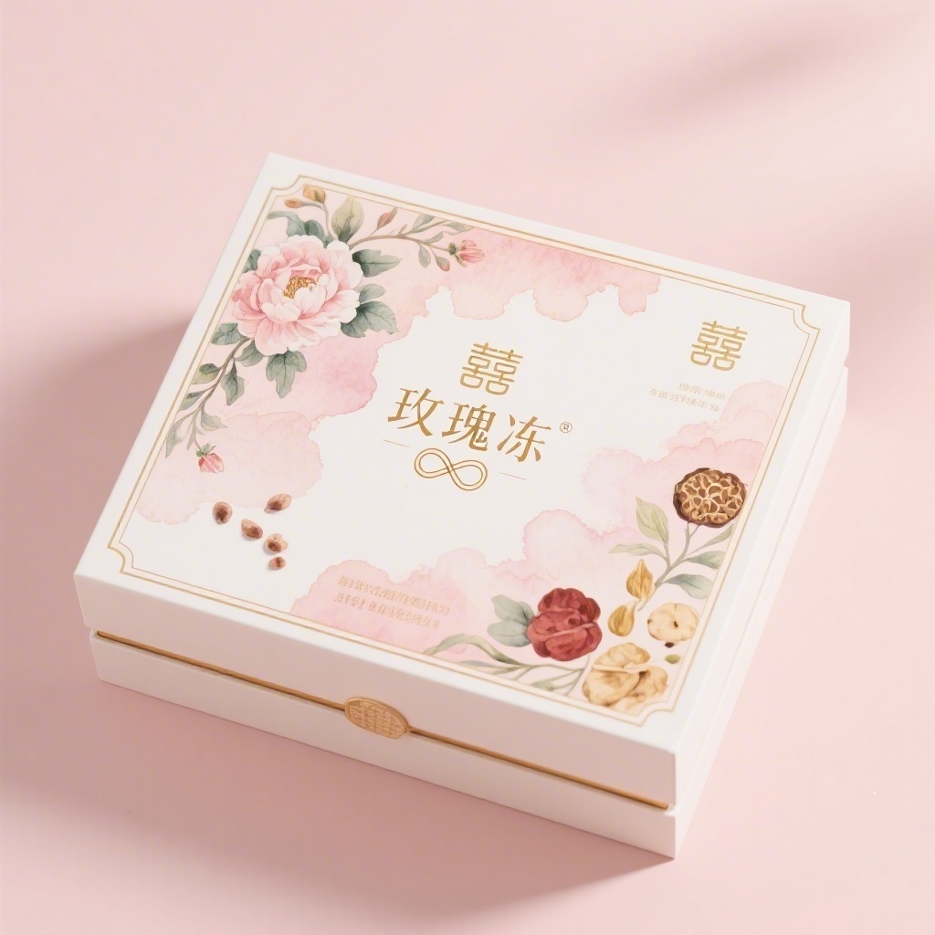 - **产品**:玫瑰冻 - **品牌名**:玫瑰冻 - **包装样式**:礼品盒 - **设计风格**:轻奢手绘插画风,融合东方婚庆元素与现代简约美学 - **设计元素**:水彩晕染纹理背景、手绘牡丹缠枝纹与天然食材组合图案、烫金描边装饰线条、双喜字与同心结符号 - **主题配色**:柔雾粉 + 象牙白
