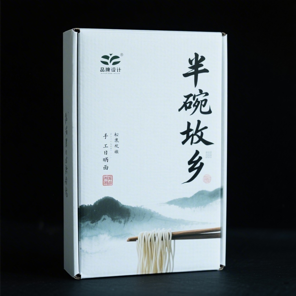 - **产品**:手工日晒面 - **品牌名**:半碗故乡 - **包装样式**:瓦楞纸箱 - **设计风格**:东方意境图文叙事风,融合宣纸肌理与书法留白美学 - **设计元素**:竖排毛笔字标题、水墨晕染底纹、手写工艺注释印章式排版、面条垂落虚实摄影嵌入留白构图 - **主题配色**:宣纸原白、松烟墨黑、淡青灰
