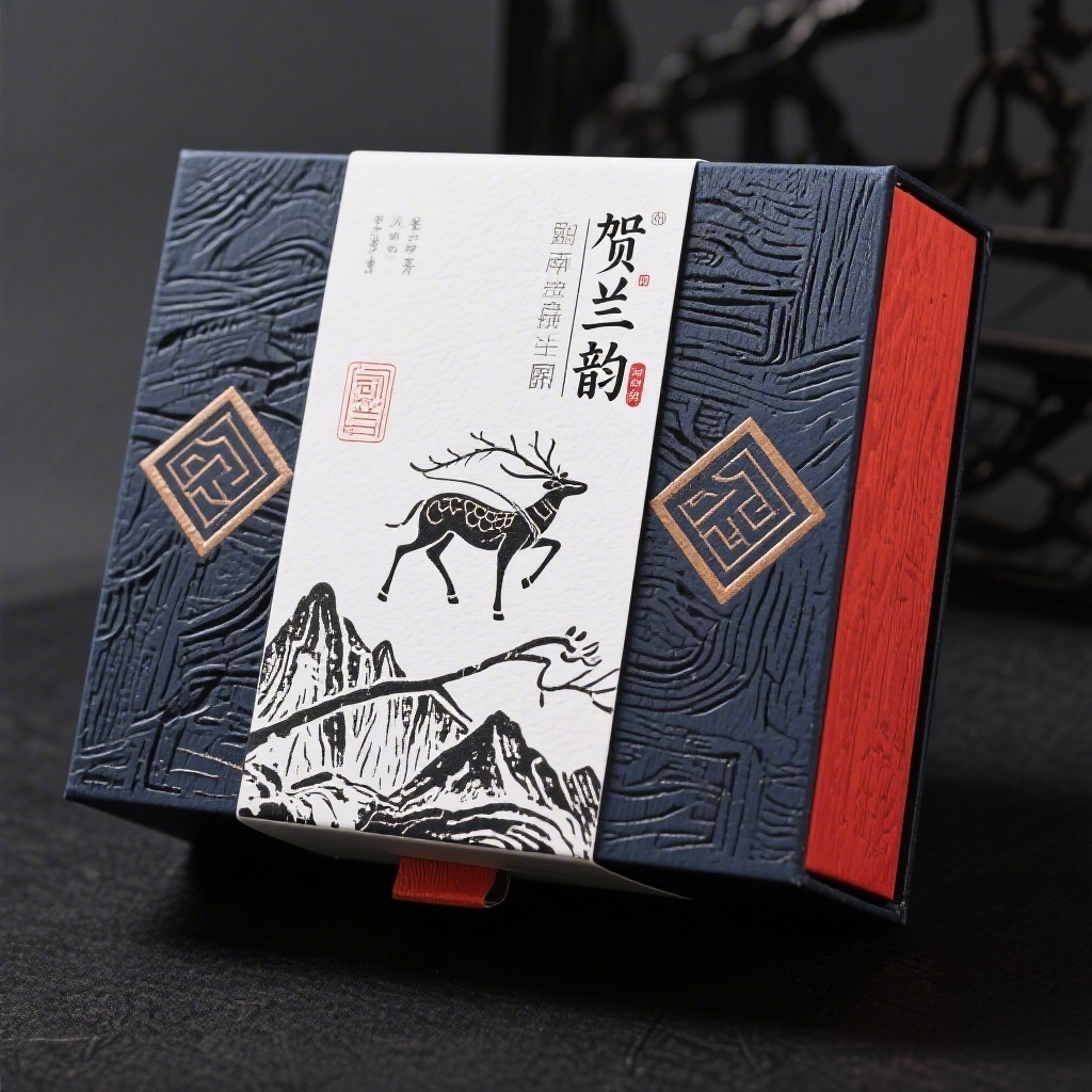 - **产品**:八宝茶 - **品牌名**:贺兰刻韵 - **包装样式**:硬卡纸盒 - **设计风格**:新中式文化复兴 - **设计元素**:贺兰山岩画狩猎图案木刻线条、西夏文几何化辅助图形、现代无衬线融合书法笔画定制字体、仿木刻刀痕肌理底纹 - **主题配色**:黑、白、灰 + 土红 + 深蓝