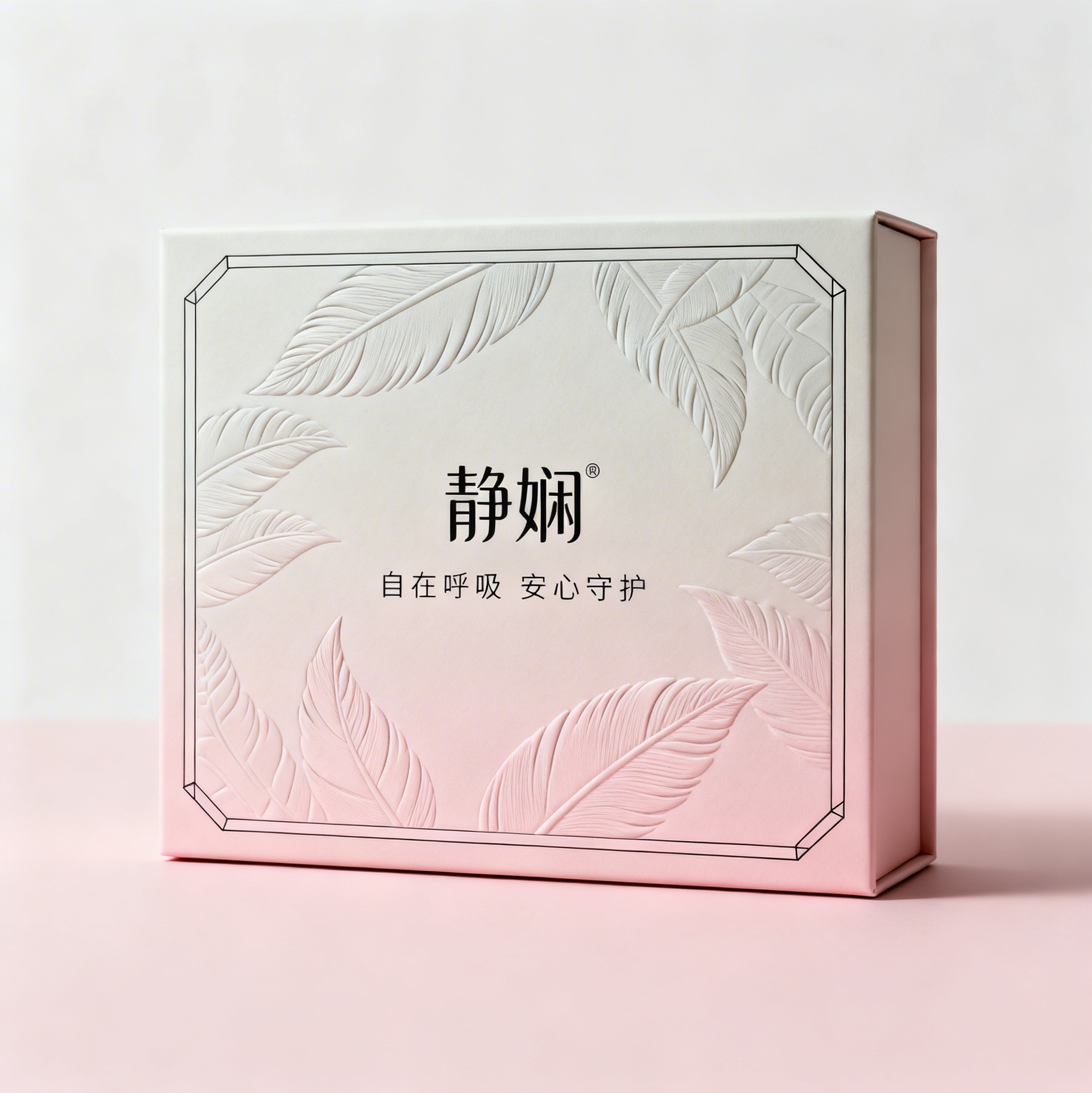 - **产品**:卫生巾 - **品牌名**:静娴 - **包装样式**:礼品盒 - **设计风格**:优雅简约现代 - **设计元素**:品牌标志“静娴”搭配宣传语“自在呼吸 安心守护”纤细字体排版、抽象舒展叶片或羽毛压印图案、极简几何线条边缘装饰、哑光浅色背景营造柔和触感视觉 - **主题配色**:柔雾粉色、浅米灰色