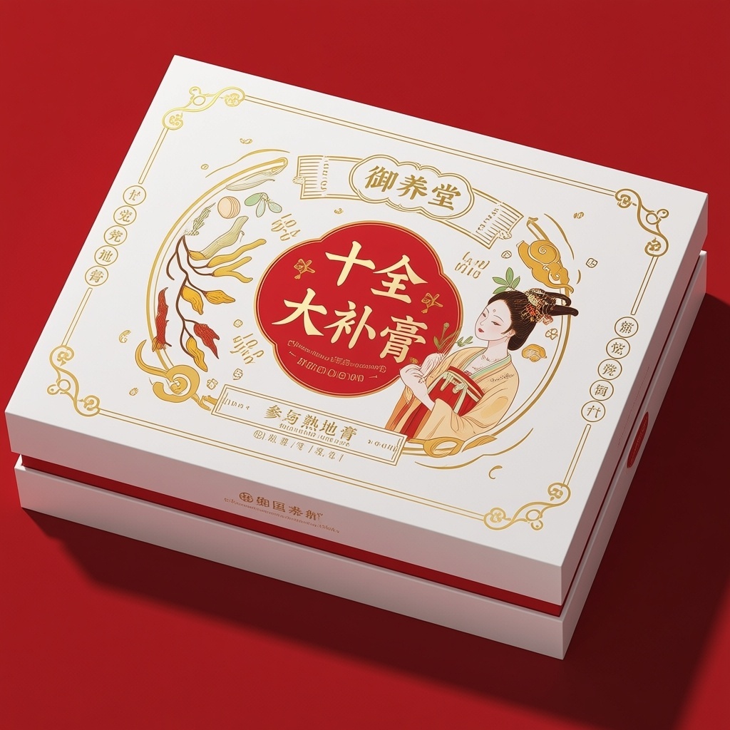 - **产品**:十全大补膏 - **品牌名**:御养堂 - **包装样式**:礼盒 - **设计风格**:新中式国潮风 - **设计元素**:新时代女性身着汉服手持药材的柔美插画、党参与熟地黄等药材纹样环绕、书法字体“十全大补膏”居中醒目排版、辅助祥云与如意边饰点缀 - **主题配色**:纯白、中国红、鎏金色