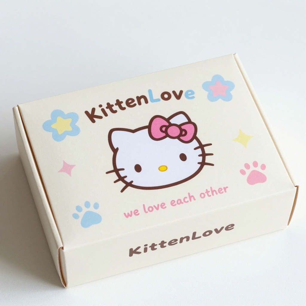 - **产品**:猫咪主题卡通礼品 - **品牌名**:KittenLove - **包装样式**:礼盒 - **设计风格**:日系萌系卡通 - **设计元素**:凯蒂猫风格猫咪头像、彩色蝴蝶结与星星花朵组合、鱼骨爪印图案、“kitten”及“we love each other”手写字体标语 - **主题配色**:米白 + 浅蓝/粉红/淡黄