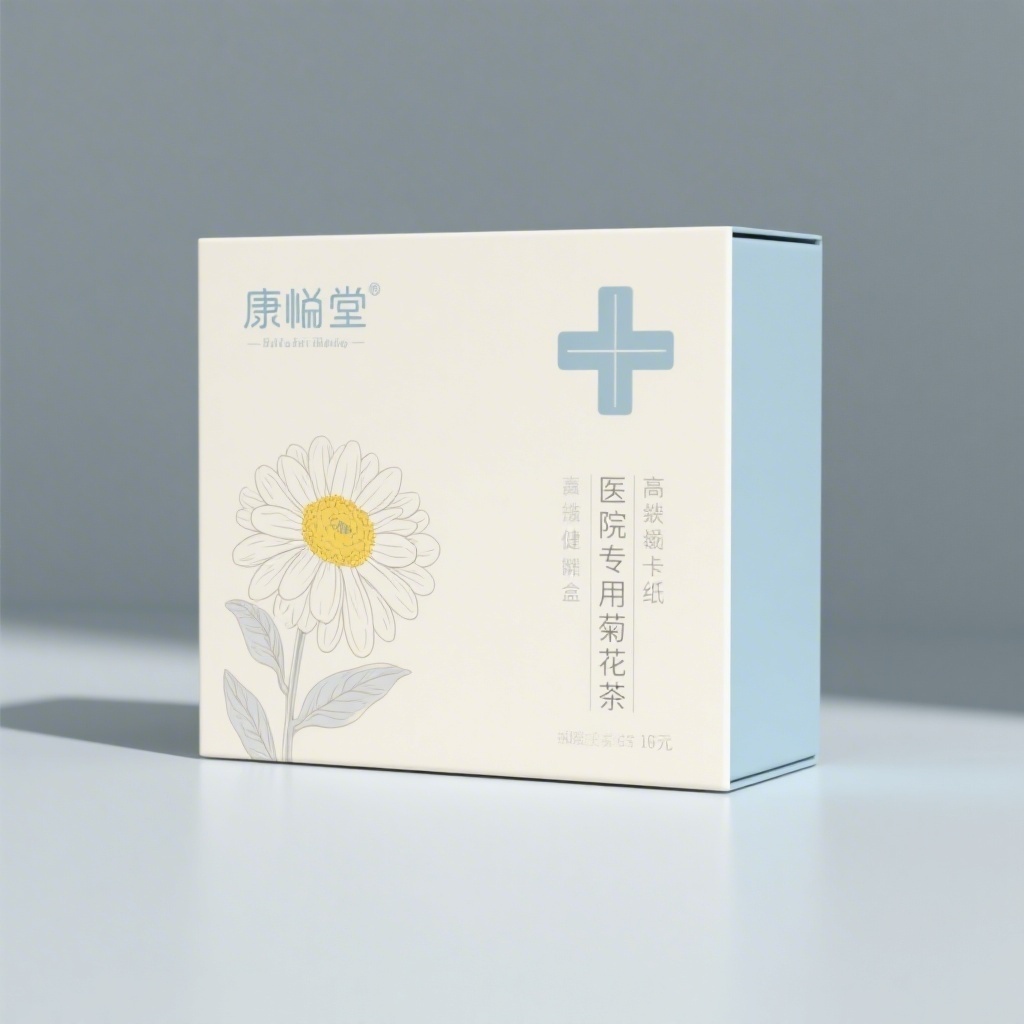 - **产品**:医院专用菊花茶 - **品牌名**:康颐堂 - **包装样式**:硬卡纸盒 - **设计风格**:现代简约医疗风 - **设计元素**:手绘菊花图案、无衬线健康标语排版、十字医疗标识融合、留白呼吸感图文布局 - **主题配色**:浅灰蓝、米白、淡菊黄