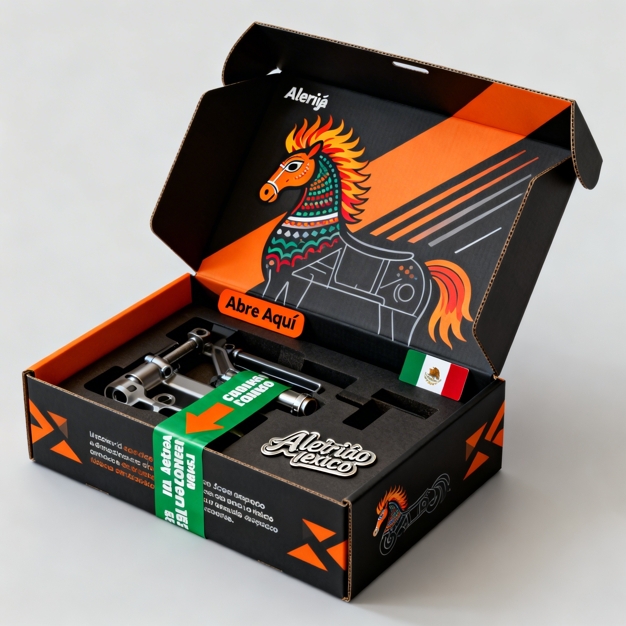 - **产品**:摩托车配件外箱 - **品牌名**:OUMURS - **包装样式**:包装刀版图 - **设计风格**:极简几何工业风 + 墨西哥民俗撞色 - **设计元素**:Alebrije风格火焰马鬃图腾、斜向速度条纹穿插零件轮廓、“Abre Aquí”橙箭易撕标、墨西哥绿胶带+白字标语、内盖西班牙语互动文案+金属贴纸赠品 - **主题配色**:哑光黑、活力橙、墨西哥国旗绿
