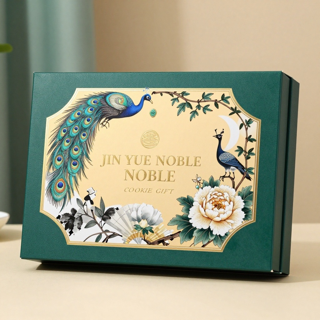 - **产品**:饼干礼盒 - **品牌名**:JIN YUE NOBLE - **包装样式**:礼盒 - **设计风格**:东方新古典主义 - **设计元素**:蓝羽孔雀纹样、盛放牡丹与藤蔓植物、水墨扇形边框、烫金品牌标识与手写体“COOKIE GIFT” - **主题配色**:墨绿、鎏金黄、月牙白
