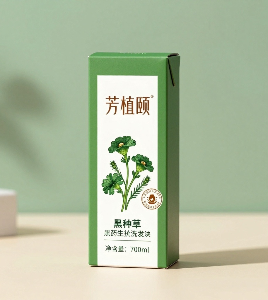 - **产品**:黑种草洗发水 - **品牌名**:芳植颐 - **包装样式**:简约纸盒 - **设计风格**:简约植物风 - **设计元素**:黑种草图案、滋养元素、优秀的图文排版 - **主题配色**:绿色、棕色、米色