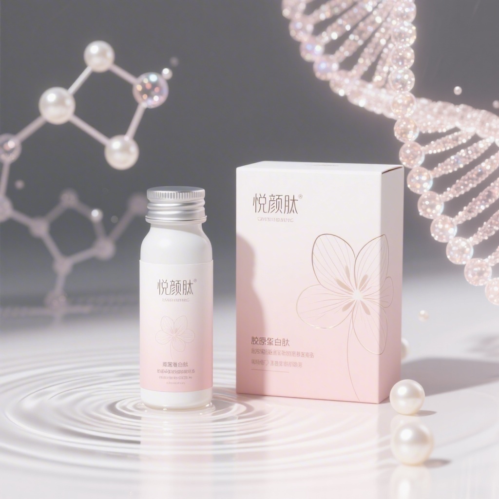 - **产品**:胶原蛋白肽饮品 - **品牌名**:悦颜肽 - **包装样式**:瓶装+外纸套标 - **设计风格**:轻奢极简风,融合生物科技感与女性柔美气质 - **设计元素**:水波纹与分子结构抽象叠加纹理背景、悬浮式胶原蛋白螺旋艺术图形、微光粒子与花瓣轮廓线条装饰、珍珠光泽点缀 - **主题配色**:柔雾粉、珍珠白