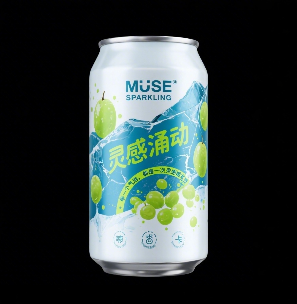 - **产品**:冰川青提味气泡水 - **品牌名**:灵感涌动MUSE SPARKLING - **包装样式**:罐装 - **设计风格**:抽象表现主义、极简冰川美学、动态视觉张力 - **设计元素**:冰裂纹理叠加青提色气泡喷溅笔触、手写体“灵感涌动”+无衬线英文副标、零糖零脂零卡图标组、核心标语“每一个气泡,都是一次灵感爆发”弧形排版于罐身中段 - **主题配色**:极地冰蓝、青提荧光绿、雾面白