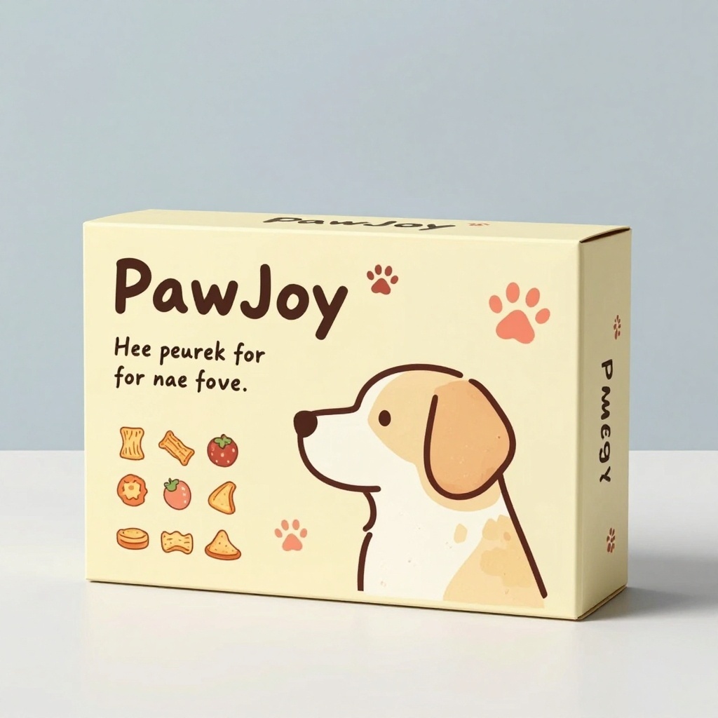 - **产品**:小狗零食 - **品牌名**:PawJoy - **包装样式**:礼盒 - **设计风格**:手绘插画风结合现代简约排版 - **设计元素**:卡通狗狗侧脸剪影、零食图标阵列、手写字体祝福语、爪印点缀图形 - **主题配色**:奶油黄、浅灰蓝、暖珊瑚红