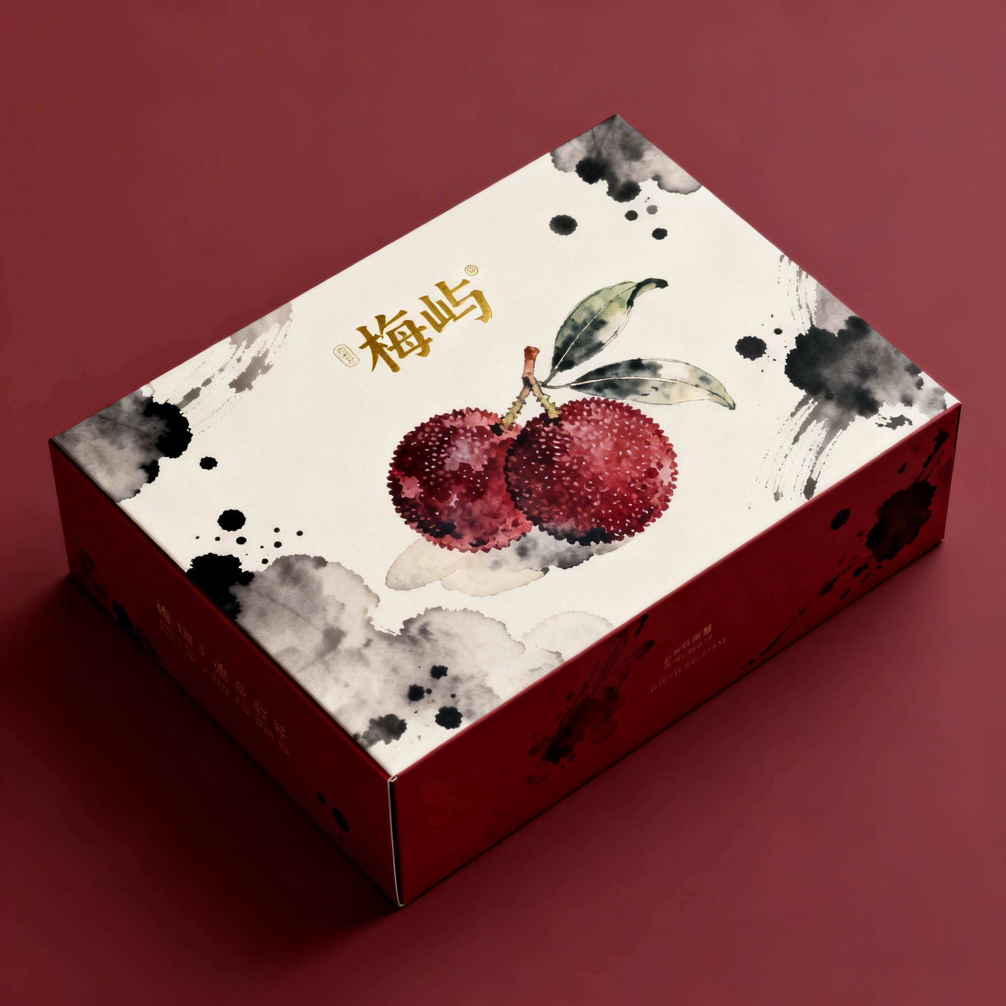 - **产品**:杨梅 - **品牌名**:梅屿 - **包装样式**:礼盒 - **设计风格**:简约精致风 - **设计元素**:手绘杨梅主视觉、留白呼吸感排版、水墨晕染底纹、烫金品牌标识 - **主题配色**:深红 + 米白 + 墨黑