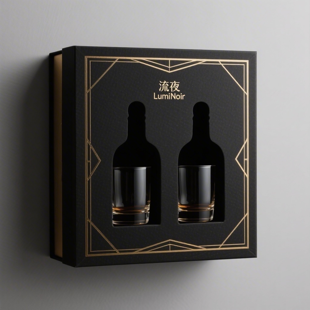 - **产品**:双支装露酒礼盒(含两只威士忌杯) - **品牌名**:鎏夜 LumiNoir - **包装样式**:礼盒 - **设计风格**:现代简约轻奢风 - **设计元素**:烫金几何线条边框、极简品牌字母浮雕标识、酒瓶轮廓负空间构图、杯体剪影对称排版 - **主题配色**:曜石黑、香槟金、雾面灰