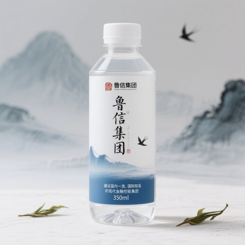 - **包装主视觉面排版**:以文字为主式排版——主标题“鲁信集团”采用书法体居于视觉中心偏上位置,占据版面40%高度;背景为极淡的水墨山泉水纹理,仅在边缘透出,不干扰文字主体