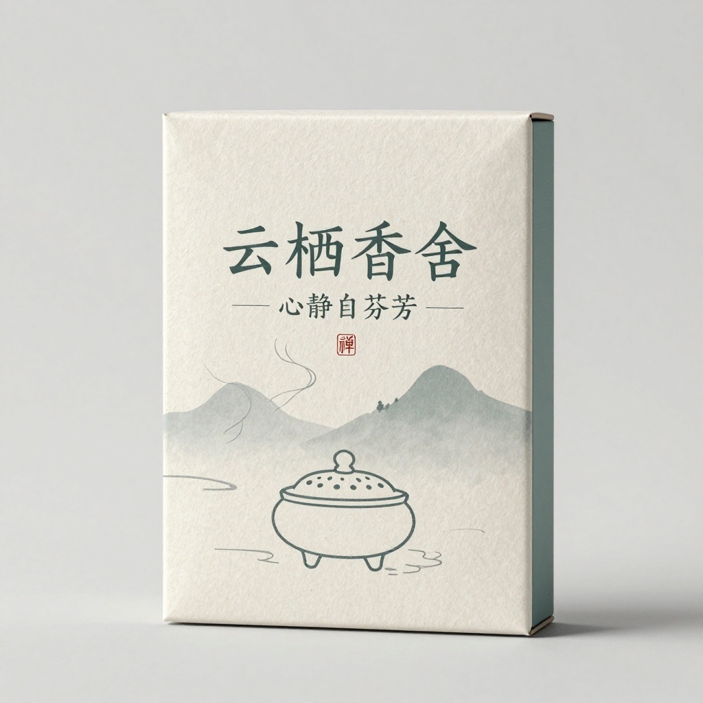- **包装主视觉面排版**:以文字为主式排版,主标题“云栖香舍”居于视觉中心偏上位置,采用纤细书法字体横向排列,下方小字“心静自芬芳”轻盈衬底;背景为极简水墨山形轮廓与飘散的香缕线条,作为纹理式点缀,整体留白占比超60%,营造空灵静谧氛围。