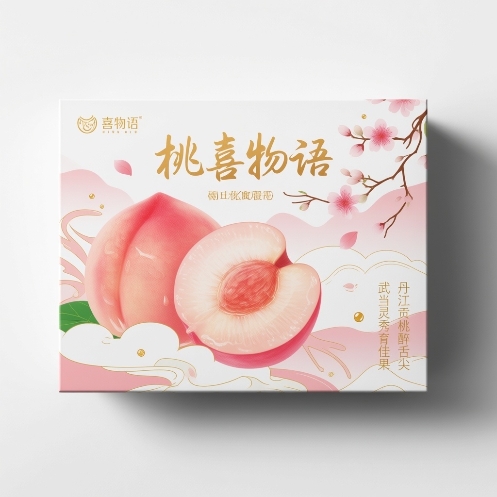 - **设计元素**:背景层为柔光渐变白底模拟晨雾感;主图案为高清水蜜桃剖面与完整果实叠影;装饰图案含飘落桃花瓣与纤细桃枝线条;点缀金色露珠小图标;纸质选用哑光触感纸增强温润手感