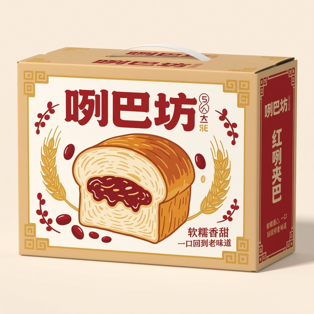 - **包装主视觉面排版**:以商品为主式排版(高清诱人的红豆夹心面包横切面居于视觉中心,面包纹理与红豆馅料清晰可见,品牌名“咧巴坊”以粗体字横向置于面包图上方1/5处,宣传语竖排于右下角形成视觉收尾)